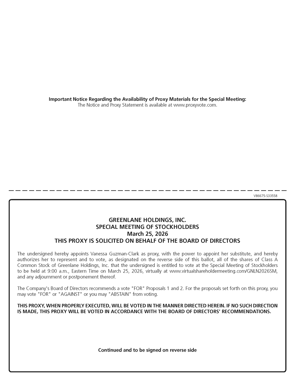 We cordially invite you to attend a special meeting of stockholders (the “Special Meeting”) of Greenlane Holdings, Inc., a Delaware corporation (the “Company”, “Greenlane”, “we”, “us” or “our”), which will be held virtually on Wednesday, March 25, 2026 at 9:00 a.m. Eastern Time via live audio webcast on the Internet at www.virtualshareholdermeeting.com/GNLN2026SM for the following purposes, as more fully described in the accompanying proxy statement for the Special Meeting (the “Proxy Statement”):