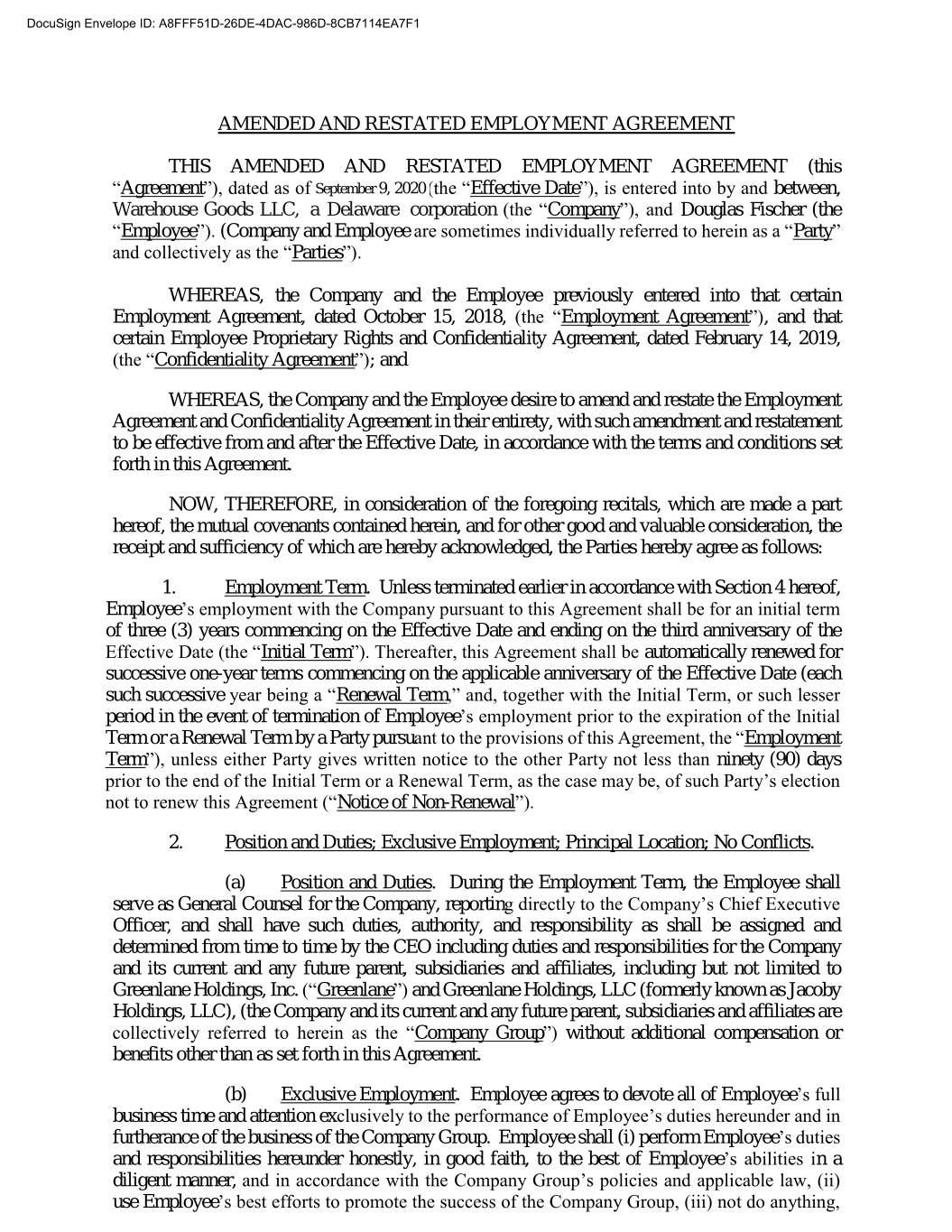 DocuSign Envelope ID: A8FFF51D-26DE-4DAC-986D-8CB7114EA7F1 AMENDED AND RESTATED EMPLOYMENT AGREEMENT THIS AMENDED AND RESTATED EMPLOYMENT AGREEMENT (this “Agreement”), dated as of SeptemberJune 29, 9 20, 202020 (the “Effective Date”), is entered into by and between, Warehouse Goods LLC, a Delaware corporation (the “Company”), and Douglas Fischer (the “Employee”). (Company and Employee are sometimes individually referred to herein as a “Party” and collectively as the “Parties”). WHEREAS, the Company and the Employee previously entered into that certain Employment Agreement, dated October 15, 2018, (the “Employment Agreement”), and that certain Employee Proprietary Rights and Confidentiality Agreement, dated February 14, 2019, (the “Confidentiality Agreement”); and WHEREAS, the Company and the Employee desire to amend and restate the Employment Agreement and Confidentiality Agreement in their entirety, with such amendment and restatement to be effective from and after the Effective Date, in accordance with the terms and conditions set forth in this Agreement. NOW, THEREFORE, in consideration of the foregoing recitals, which are made a part hereof, the mutual covenants contained herein, and for other good and valuable consideration, the receipt and sufficiency of which are hereby acknowledged, the Parties hereby agree as follows: 1. Employment Term. Unless terminated earlier in accordance with Section 4 hereof, Employee’s employment with the Company pursuant to this Agreement shall be for an initial term of three (3) years commencing on the Effective Date and ending on the third anniversary of the Effective Date (the “Initial Term”). Thereafter, this Agreement shall be automatically renewed for successive one-year terms commencing on the applicable anniversary of the Effective Date (each such successive year being a “Renewal Term,” and, together with the Initial Term, or such lesser period in the event of termination of Employee’s employment prior to the expiration of the Initial Term or a Renewal Term by a Party pursuant to the provisions of this Agreement, the “Employment Term”), unless either Party gives written notice to the other Party not less than ninety (90) days prior to the end of the Initial Term or a Renewal Term, as the case may be, of such Party’s election not to renew this Agreement (“Notice of Non-Renewal”). 2. Position and Duties; Exclusive Employment; Principal Location; No Conflicts. (a) Position and Duties. During the Employment Term, the Employee shall serve as General Counsel for the Company, reporting directly to the Company’s Chief Executive Officer, and shall have such duties, authority, and responsibility as shall be assigned and determined from time to time by the CEO including duties and responsibilities for the Company and its current and any future parent, subsidiaries and affiliates, including but not limited to Greenlane Holdings, Inc. (“Greenlane”) and Greenlane Holdings, LLC (formerly known as Jacoby Holdings, LLC), (the Company and its current and any future parent, subsidiaries and affiliates are collectively referred to herein as the “Company Group”) without additional compensation or benefits other than as set forth in this Agreement. (b) Exclusive Employment. Employee agrees to devote all of Employee’s full business time and attention exclusively to the performance of Employee’s duties hereunder and in furtherance of the business of the Company Group. Employee shall (i) perform Employee’s duties and responsibilities hereunder honestly, in good faith, to the best of Employee’s abilities in a diligent manner, and in accordance with the Company Group’s policies and applicable law, (ii) use Employee’s best efforts to promote the success of the Company Group, (iii) not do anything,