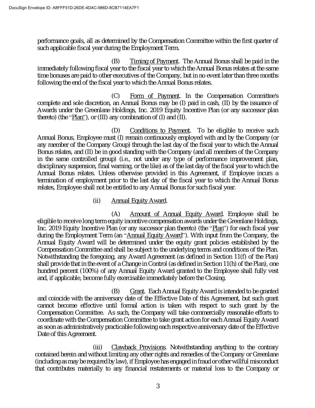 DocuSign Envelope ID: A8FFF51D-26DE-4DAC-986D-8CB7114EA7F1 performance goals, all as determined by the Compensation Committee within the first quarter of such applicable fiscal year during the Employment Term. (B) Timing of Payment. The Annual Bonus shall be paid in the immediately following fiscal year to the fiscal year to which the Annual Bonus relates at the same time bonuses are paid to other executives of the Company, but in no event later than three months following the end of the fiscal year to which the Annual Bonus relates. (C) Form of Payment. In the Compensation Committee's complete and sole discretion, an Annual Bonus may be (I) paid in cash, (II) by the issuance of Awards under the Greenlane Holdings, Inc. 2019 Equity Incentive Plan (or any successor plan thereto) (the “Plan”), or (III) any combination of (I) and (II). (D) Conditions to Payment. To be eligible to receive such Annual Bonus, Employee must (I) remain continuously employed with and by the Company (or any member of the Company Group) through the last day of the fiscal year to which the Annual Bonus relates, and (II) be in good standing with the Company (and all members of the Company in the same controlled group) (i.e., not under any type of performance improvement plan, disciplinary suspension, final warning, or the like) as of the last day of the fiscal year to which the Annual Bonus relates. Unless otherwise provided in this Agreement, if Employee incurs a termination of employment prior to the last day of the fiscal year to which the Annual Bonus relates, Employee shall not be entitled to any Annual Bonus for such fiscal year. (ii) Annual Equity Award. (A) Amount of Annual Equity Award. Employee shall be eligible to receive long term equity incentive compensation awards under the Greenlane Holdings, Inc. 2019 Equity Incentive Plan (or any successor plan thereto) (the “Plan”) for each fiscal year during the Employment Term (an “Annual Equity Award”). With input from the Company, the Annual Equity Award will be determined under the equity grant policies established by the Compensation Committee and shall be subject to the underlying terms and conditions of the Plan. Notwithstanding the foregoing, any Award Agreement (as defined in Section 11(f) of the Plan) shall provide that in the event of a Change in Control (as defined in Section 11(h) of the Plan), one hundred percent (100%) of any Annual Equity Award granted to the Employee shall fully vest and, if applicable, become fully exercisable immediately before the Closing. (B) Grant. Each Annual Equity Award is intended to be granted and coincide with the anniversary date of the Effective Date of this Agreement, but such grant cannot become effective until formal action is taken with respect to such grant by the Compensation Committee. As such, the Company will take commercially reasonable efforts to coordinate with the Compensation Committee to take grant action for each Annual Equity Award as soon as administratively practicable following each respective anniversary date of the Effective Date of this Agreement. (iii) Clawback Provisions. Notwithstanding anything to the contrary contained herein and without limiting any other rights and remedies of the Company or Greenlane (including as may be required by law), if Employee has engaged in fraud or other willful misconduct that contributes materially to any financial restatements or material loss to the Company or 3