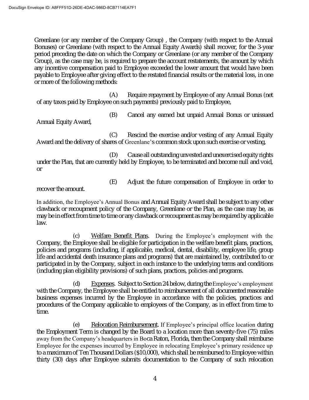 DocuSign Envelope ID: A8FFF51D-26DE-4DAC-986D-8CB7114EA7F1 Greenlane (or any member of the Company Group) , the Company (with respect to the Annual Bonuses) or Greenlane (with respect to the Annual Equity Awards) shall recover, for the 3-year period preceding the date on which the Company or Greenlane (or any member of the Company Group), as the case may be, is required to prepare the account restatements, the amount by which any incentive compensation paid to Employee exceeded the lower amount that would have been payable to Employee after giving effect to the restated financial results or the material loss, in one or more of the following methods: (A) Require repayment by Employee of any Annual Bonus (net of any taxes paid by Employee on such payments) previously paid to Employee, (B) Cancel any earned but unpaid Annual Bonus or unissued Annual Equity Award, (C) Rescind the exercise and/or vesting of any Annual Equity Award and the delivery of shares of Greenlane’s common stock upon such exercise or vesting, (D) Cause all outstanding unvested and unexercised equity rights under the Plan, that are currently held by Employee, to be terminated and become null and void, or (E) Adjust the future compensation of Employee in order to recover the amount. In addition, the Employee’s Annual Bonus and Annual Equity Award shall be subject to any other clawback or recoupment policy of the Company, Greenlane or the Plan, as the case may be, as may be in effect from time to time or any clawback or recoupment as may be required by applicable law. (c) Welfare Benefit Plans. During the Employee’s employment with the Company, the Employee shall be eligible for participation in the welfare benefit plans, practices, policies and programs (including, if applicable, medical, dental, disability, employee life, group life and accidental death insurance plans and programs) that are maintained by, contributed to or participated in by the Company, subject in each instance to the underlying terms and conditions (including plan eligibility provisions) of such plans, practices, policies and programs. (d) Expenses. Subject to Section 24 below, during the Employee’s employment with the Company, the Employee shall be entitled to reimbursement of all documented reasonable business expenses incurred by the Employee in accordance with the policies, practices and procedures of the Company applicable to employees of the Company, as in effect from time to time. (e) Relocation Reimbursement. If Employee’s principal office location during the Employment Term is changed by the Board to a location more than seventy-five (75) miles away from the Company’s headquarters in Boca Raton, Florida, then the Company shall reimburse Employee for the expenses incurred by Employee in relocating Employee’s primary residence up to a maximum of Ten Thousand Dollars ($10,000), which shall be reimbursed to Employee within thirty (30) days after Employee submits documentation to the Company of such relocation 4
