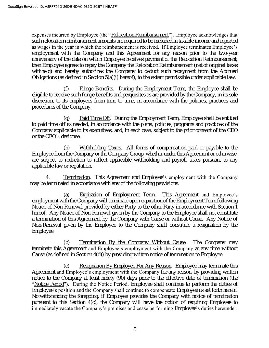 DocuSign Envelope ID: A8FFF51D-26DE-4DAC-986D-8CB7114EA7F1 expenses incurred by Employee (the “Relocation Reimbursement”). Employee acknowledges that such relocation reimbursement amounts are required to be included in taxable income and reported as wages in the year in which the reimbursement is received. If Employee terminates Employee’s employment with the Company and this Agreement for any reason prior to the two-year anniversary of the date on which Employee receives payment of the Relocation Reimbursement, then Employee agrees to repay the Company the Relocation Reimbursement (net of original taxes withheld) and hereby authorizes the Company to deduct such repayment from the Accrued Obligations (as defined in Section 5(a)(i) hereof), to the extent permissible under applicable law. (f) Fringe Benefits. During the Employment Term, the Employee shall be eligible to receive such fringe benefits and perquisites as are provided by the Company, in its sole discretion, to its employees from time to time, in accordance with the policies, practices and procedures of the Company. (g) Paid Time Off. During the Employment Term, Employee shall be entitled to paid time off as needed, in accordance with the plans, policies, programs and practices of the Company applicable to its executives, and, in each case, subject to the prior consent of the CEO or the CEO’s designee. (h) Withholding Taxes. All forms of compensation paid or payable to the Employee from the Company or the Company Group, whether under this Agreement or otherwise, are subject to reduction to reflect applicable withholding and payroll taxes pursuant to any applicable law or regulation. 4. Termination. This Agreement and Employee’s employment with the Company may be terminated in accordance with any of the following provisions. (a) Expiration of Employment Term. This Agreement and Employee’s employment with the Company will terminate upon expiration of the Employment Term following Notice of Non-Renewal provided by either Party to the other Party in accordance with Section 1 hereof. Any Notice of Non-Renewal given by the Company to the Employee shall not constitute a termination of this Agreement by the Company with Cause or without Cause. Any Notice of Non-Renewal given by the Employee to the Company shall constitute a resignation by the Employee. (b) Termination By the Company Without Cause. The Company may terminate this Agreement and Employee’s employment with the Company at any time without Cause (as defined in Section 4(d)) by providing written notice of termination to Employee. (c) Resignation By Employee For Any Reason. Employee may terminate this Agreement and Employee’s employment with the Company for any reason, by providing written notice to the Company at least ninety (90) days prior to the effective date of termination (the “Notice Period”). During the Notice Period, Employee shall continue to perform the duties of Employee’s position and the Company shall continue to compensate Employee as set forth herein. Notwithstanding the foregoing, if Employee provides the Company with notice of termination pursuant to this Section 4(c), the Company will have the option of requiring Employee to immediately vacate the Company’s premises and cease performing Employee’s duties hereunder. 5
