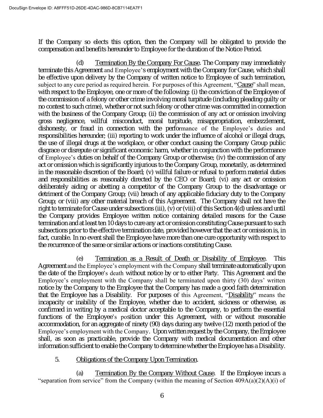 DocuSign Envelope ID: A8FFF51D-26DE-4DAC-986D-8CB7114EA7F1 If the Company so elects this option, then the Company will be obligated to provide the compensation and benefits hereunder to Employee for the duration of the Notice Period. (d) Termination By the Company For Cause. The Company may immediately terminate this Agreement and Employee’s employment with the Company for Cause, which shall be effective upon delivery by the Company of written notice to Employee of such termination, subject to any cure period as required herein. For purposes of this Agreement, “Cause” shall mean, with respect to the Employee, one or more of the following: (i) the conviction of the Employee of the commission of a felony or other crime involving moral turpitude (including pleading guilty or no contest to such crime), whether or not such felony or other crime was committed in connection with the business of the Company Group; (ii) the commission of any act or omission involving gross negligence, willful misconduct, moral turpitude, misappropriation, embezzlement, dishonesty, or fraud in connection with the performance of the Employee’s duties and responsibilities hereunder; (iii) reporting to work under the influence of alcohol or illegal drugs, the use of illegal drugs at the workplace, or other conduct causing the Company Group public disgrace or disrepute or significant economic harm, whether in conjunction with the performance of Employee’s duties on behalf of the Company Group or otherwise; (iv) the commission of any act or omission which is significantly injurious to the Company Group, monetarily, as determined in the reasonable discretion of the Board; (v) willful failure or refusal to perform material duties and responsibilities as reasonably directed by the CEO or Board; (vi) any act or omission deliberately aiding or abetting a competitor of the Company Group to the disadvantage or detriment of the Company Group; (vii) breach of any applicable fiduciary duty to the Company Group; or (viii) any other material breach of this Agreement. The Company shall not have the right to terminate for Cause under subsections (iii), (v) or (viii) of this Section 4(d) unless and until the Company provides Employee written notice containing detailed reasons for the Cause termination and at least ten 10 days to cure any act or omission constituting Cause pursuant to such subsections prior to the effective termination date, provided however that the act or omission is, in fact, curable. In no event shall the Employee have more than one cure opportunity with respect to the recurrence of the same or similar actions or inactions constituting Cause. (e) Termination as a Result of Death or Disability of Employee. This Agreement and the Employee’s employment with the Company shall terminate automatically upon the date of the Employee’s death without notice by or to either Party. This Agreement and the Employee’s employment with the Company shall be terminated upon thirty (30) days’ written notice by the Company to the Employee that the Company has made a good faith determination that the Employee has a Disability. For purposes of this Agreement, “Disability” means the incapacity or inability of the Employee, whether due to accident, sickness or otherwise, as confirmed in writing by a medical doctor acceptable to the Company, to perform the essential functions of the Employee’s position under this Agreement, with or without reasonable accommodation, for an aggregate of ninety (90) days during any twelve (12) month period of the Employee’s employment with the Company. Upon written request by the Company, the Employee shall, as soon as practicable, provide the Company with medical documentation and other information sufficient to enable the Company to determine whether the Employee has a Disability. 5. Obligations of the Company Upon Termination. (a) Termination By the Company Without Cause. If the Employee incurs a “separation from service” from the Company (within the meaning of Section 409A(a)(2)(A)(i) of 6
