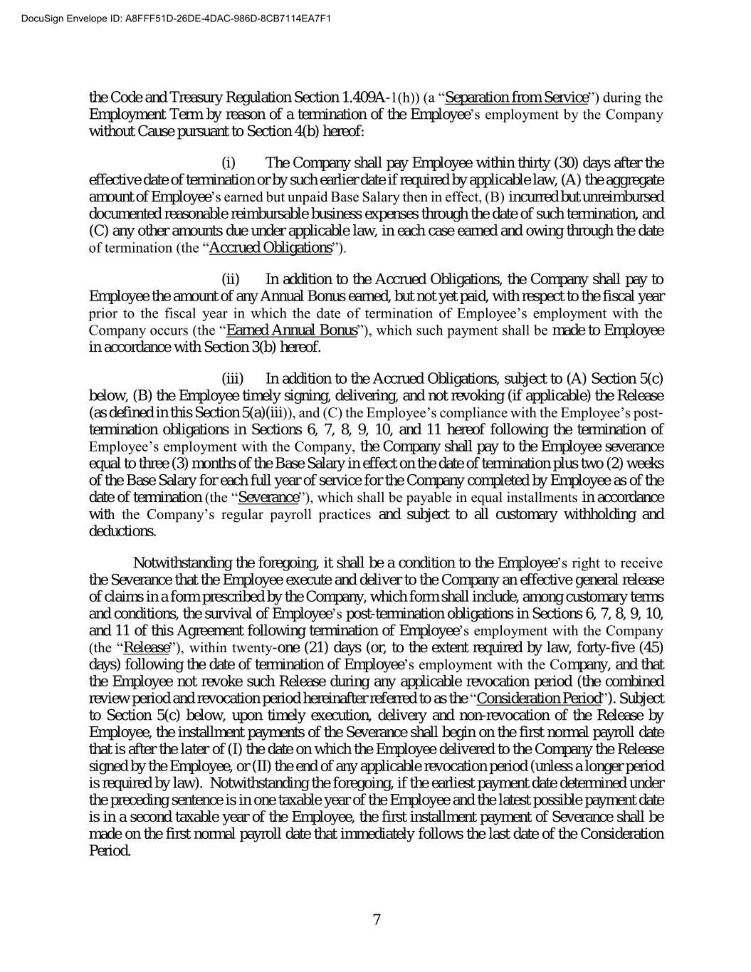 DocuSign Envelope ID: A8FFF51D-26DE-4DAC-986D-8CB7114EA7F1 the Code and Treasury Regulation Section 1.409A-1(h)) (a “Separation from Service”) during the Employment Term by reason of a termination of the Employee’s employment by the Company without Cause pursuant to Section 4(b) hereof: (i) The Company shall pay Employee within thirty (30) days after the effective date of termination or by such earlier date if required by applicable law, (A) the aggregate amount of Employee’s earned but unpaid Base Salary then in effect, (B) incurred but unreimbursed documented reasonable reimbursable business expenses through the date of such termination, and (C) any other amounts due under applicable law, in each case earned and owing through the date of termination (the “Accrued Obligations”). (ii) In addition to the Accrued Obligations, the Company shall pay to Employee the amount of any Annual Bonus earned, but not yet paid, with respect to the fiscal year prior to the fiscal year in which the date of termination of Employee’s employment with the Company occurs (the “Earned Annual Bonus”), which such payment shall be made to Employee in accordance with Section 3(b) hereof. (iii) In addition to the Accrued Obligations, subject to (A) Section 5(c) below, (B) the Employee timely signing, delivering, and not revoking (if applicable) the Release (as defined in this Section 5(a)(iii)), and (C) the Employee’s compliance with the Employee’s post- termination obligations in Sections 6, 7, 8, 9, 10, and 11 hereof following the termination of Employee’s employment with the Company, the Company shall pay to the Employee severance equal to three (3) months of the Base Salary in effect on the date of termination plus two (2) weeks of the Base Salary for each full year of service for the Company completed by Employee as of the date of termination (the “Severance”), which shall be payable in equal installments in accordance with the Company’s regular payroll practices and subject to all customary withholding and deductions. Notwithstanding the foregoing, it shall be a condition to the Employee’s right to receive the Severance that the Employee execute and deliver to the Company an effective general release of claims in a form prescribed by the Company, which form shall include, among customary terms and conditions, the survival of Employee’s post-termination obligations in Sections 6, 7, 8, 9, 10, and 11 of this Agreement following termination of Employee’s employment with the Company (the “Release”), within twenty-one (21) days (or, to the extent required by law, forty-five (45) days) following the date of termination of Employee’s employment with the Company, and that the Employee not revoke such Release during any applicable revocation period (the combined review period and revocation period hereinafter referred to as the “Consideration Period”). Subject to Section 5(c) below, upon timely execution, delivery and non-revocation of the Release by Employee, the installment payments of the Severance shall begin on the first normal payroll date that is after the later of (I) the date on which the Employee delivered to the Company the Release signed by the Employee, or (II) the end of any applicable revocation period (unless a longer period is required by law). Notwithstanding the foregoing, if the earliest payment date determined under the preceding sentence is in one taxable year of the Employee and the latest possible payment date is in a second taxable year of the Employee, the first installment payment of Severance shall be made on the first normal payroll date that immediately follows the last date of the Consideration Period. 7