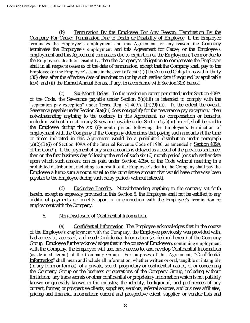DocuSign Envelope ID: A8FFF51D-26DE-4DAC-986D-8CB7114EA7F1 (b) Termination By the Employee For Any Reason; Termination By the Company For Cause; Termination Due to Death or Disability of Employee. If the Employee terminates the Employee’s employment and this Agreement for any reason, the Company terminates the Employee’s employment and this Agreement for Cause, or the Employee’s employment and this Agreement terminates due to expiration of the Employment Term or due to the Employee’s death or Disability, then the Company’s obligation to compensate the Employee shall in all respects cease as of the date of termination, except that the Company shall pay to the Employee (or the Employee’s estate in the event of death) (i) the Accrued Obligations within thirty (30) days after the effective date of termination (or by such earlier date if required by applicable law), and (ii) the Earned Annual Bonus, if any, in accordance with Section 3(b) hereof. (c) Six-Month Delay. To the maximum extent permitted under Section 409A of the Code, the Severance payable under Section 5(a)(iii) is intended to comply with the “separation pay exception” under Treas. Reg. §1.409A-1(b)(9)(iii). To the extent the overall Severance payable under Section 5(a)(iii) does not qualify for the “severance pay exception,” then notwithstanding anything to the contrary in this Agreement, no compensation or benefits, including without limitation any Severance payable under Section 5(a)(iii) hereof, shall be paid to the Employee during the six (6)-month period following the Employee’s termination of employment with the Company if the Company determines that paying such amounts at the time or times indicated in this Agreement would be a prohibited distribution under paragraph (a)(2)(B)(i) of Section 409A of the Internal Revenue Code of 1986, as amended (“Section 409A of the Code”). If the payment of any such amounts is delayed as a result of the previous sentence, then on the first business day following the end of such six (6) month period (or such earlier date upon which such amount can be paid under Section 409A of the Code without resulting in a prohibited distribution, including as a result of the Employee’s death), the Company shall pay the Employee a lump-sum amount equal to the cumulative amount that would have otherwise been payable to the Employee during such delay period (without interest). (d) Exclusive Benefits. Notwithstanding anything to the contrary set forth herein, except as expressly provided in this Section 5, the Employee shall not be entitled to any additional payments or benefits upon or in connection with the Employee’s termination of employment with the Company. 6. Non-Disclosure of Confidential Information. (a) Confidential Information. The Employee acknowledges that in the course of the Employee’s employment with the Company, the Employee previously was provided with, had access to, accessed, and used Confidential Information (as defined herein) of the Company Group. Employee further acknowledges that in the course of Employee’s continuing employment with the Company, the Employee will use, have access to, and develop Confidential Information (as defined herein) of the Company Group. For purposes of this Agreement, “Confidential Information” shall mean and include all information, whether written or oral, tangible or intangible (in any form or format), of a private, secret, proprietary or confidential nature, of or concerning the Company Group or the business or operations of the Company Group, including without limitation: any trade secrets or other confidential or proprietary information which is not publicly known or generally known in the industry; the identity, background, and preferences of any current, former, or prospective clients, suppliers, vendors, referral sources, and business affiliates; pricing and financial information; current and prospective client, supplier, or vendor lists and 8