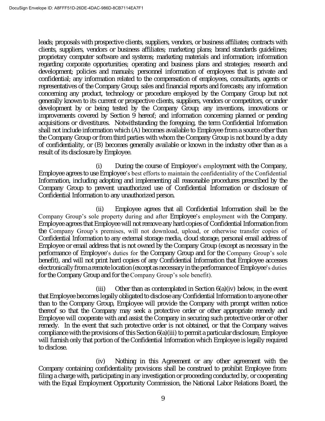 DocuSign Envelope ID: A8FFF51D-26DE-4DAC-986D-8CB7114EA7F1 leads; proposals with prospective clients, suppliers, vendors, or business affiliates; contracts with clients, suppliers, vendors or business affiliates; marketing plans; brand standards guidelines; proprietary computer software and systems; marketing materials and information; information regarding corporate opportunities; operating and business plans and strategies; research and development; policies and manuals; personnel information of employees that is private and confidential; any information related to the compensation of employees, consultants, agents or representatives of the Company Group; sales and financial reports and forecasts; any information concerning any product, technology or procedure employed by the Company Group but not generally known to its current or prospective clients, suppliers, vendors or competitors, or under development by or being tested by the Company Group; any inventions, innovations or improvements covered by Section 9 hereof; and information concerning planned or pending acquisitions or divestitures. Notwithstanding the foregoing, the term Confidential Information shall not include information which (A) becomes available to Employee from a source other than the Company Group or from third parties with whom the Company Group is not bound by a duty of confidentiality, or (B) becomes generally available or known in the industry other than as a result of its disclosure by Employee. (i) During the course of Employee’s employment with the Company, Employee agrees to use Employee’s best efforts to maintain the confidentiality of the Confidential Information, including adopting and implementing all reasonable procedures prescribed by the Company Group to prevent unauthorized use of Confidential Information or disclosure of Confidential Information to any unauthorized person. (ii) Employee agrees that all Confidential Information shall be the Company Group’s sole property during and after Employee’s employment with the Company. Employee agrees that Employee will not remove any hard copies of Confidential Information from the Company Group’s premises, will not download, upload, or otherwise transfer copies of Confidential Information to any external storage media, cloud storage, personal email address of Employee or email address that is not owned by the Company Group (except as necessary in the performance of Employee’s duties for the Company Group and for the Company Group’s sole benefit), and will not print hard copies of any Confidential Information that Employee accesses electronically from a remote location (except as necessary in the performance of Employee’s duties for the Company Group and for the Company Group’s sole benefit). (iii) Other than as contemplated in Section 6(a)(iv) below, in the event that Employee becomes legally obligated to disclose any Confidential Information to anyone other than to the Company Group, Employee will provide the Company with prompt written notice thereof so that the Company may seek a protective order or other appropriate remedy and Employee will cooperate with and assist the Company in securing such protective order or other remedy. In the event that such protective order is not obtained, or that the Company waives compliance with the provisions of this Section 6(a)(iii) to permit a particular disclosure, Employee will furnish only that portion of the Confidential Information which Employee is legally required to disclose. (iv) Nothing in this Agreement or any other agreement with the Company containing confidentiality provisions shall be construed to prohibit Employee from: filing a charge with, participating in any investigation or proceeding conducted by, or cooperating with the Equal Employment Opportunity Commission, the National Labor Relations Board, the 9