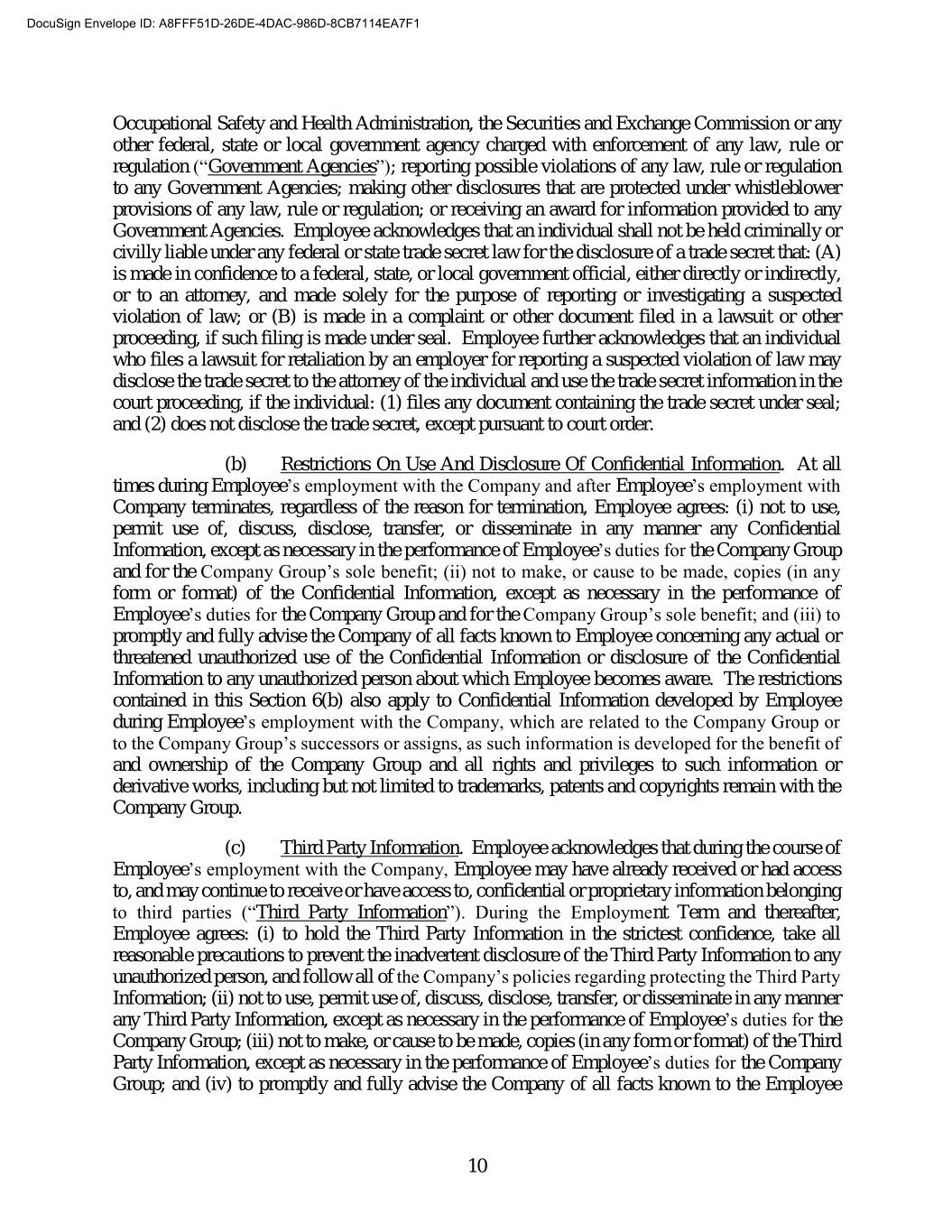 DocuSign Envelope ID: A8FFF51D-26DE-4DAC-986D-8CB7114EA7F1 Occupational Safety and Health Administration, the Securities and Exchange Commission or any other federal, state or local government agency charged with enforcement of any law, rule or regulation (“Government Agencies”); reporting possible violations of any law, rule or regulation to any Government Agencies; making other disclosures that are protected under whistleblower provisions of any law, rule or regulation; or receiving an award for information provided to any Government Agencies. Employee acknowledges that an individual shall not be held criminally or civilly liable under any federal or state trade secret law for the disclosure of a trade secret that: (A) is made in confidence to a federal, state, or local government official, either directly or indirectly, or to an attorney, and made solely for the purpose of reporting or investigating a suspected violation of law; or (B) is made in a complaint or other document filed in a lawsuit or other proceeding, if such filing is made under seal. Employee further acknowledges that an individual who files a lawsuit for retaliation by an employer for reporting a suspected violation of law may disclose the trade secret to the attorney of the individual and use the trade secret information in the court proceeding, if the individual: (1) files any document containing the trade secret under seal; and (2) does not disclose the trade secret, except pursuant to court order. (b) Restrictions On Use And Disclosure Of Confidential Information. At all times during Employee’s employment with the Company and after Employee’s employment with Company terminates, regardless of the reason for termination, Employee agrees: (i) not to use, permit use of, discuss, disclose, transfer, or disseminate in any manner any Confidential Information, except as necessary in the performance of Employee’s duties for the Company Group and for the Company Group’s sole benefit; (ii) not to make, or cause to be made, copies (in any form or format) of the Confidential Information, except as necessary in the performance of Employee’s duties for the Company Group and for the Company Group’s sole benefit; and (iii) to promptly and fully advise the Company of all facts known to Employee concerning any actual or threatened unauthorized use of the Confidential Information or disclosure of the Confidential Information to any unauthorized person about which Employee becomes aware. The restrictions contained in this Section 6(b) also apply to Confidential Information developed by Employee during Employee’s employment with the Company, which are related to the Company Group or to the Company Group’s successors or assigns, as such information is developed for the benefit of and ownership of the Company Group and all rights and privileges to such information or derivative works, including but not limited to trademarks, patents and copyrights remain with the Company Group. (c) Third Party Information. Employee acknowledges that during the course of Employee’s employment with the Company, Employee may have already received or had access to, and may continue to receive or have access to, confidential or proprietary information belonging to third parties (“Third Party Information”). During the Employment Term and thereafter, Employee agrees: (i) to hold the Third Party Information in the strictest confidence, take all reasonable precautions to prevent the inadvertent disclosure of the Third Party Information to any unauthorized person, and follow all of the Company’s policies regarding protecting the Third Party Information; (ii) not to use, permit use of, discuss, disclose, transfer, or disseminate in any manner any Third Party Information, except as necessary in the performance of Employee’s duties for the Company Group; (iii) not to make, or cause to be made, copies (in any form or format) of the Third Party Information, except as necessary in the performance of Employee’s duties for the Company Group; and (iv) to promptly and fully advise the Company of all facts known to the Employee 10