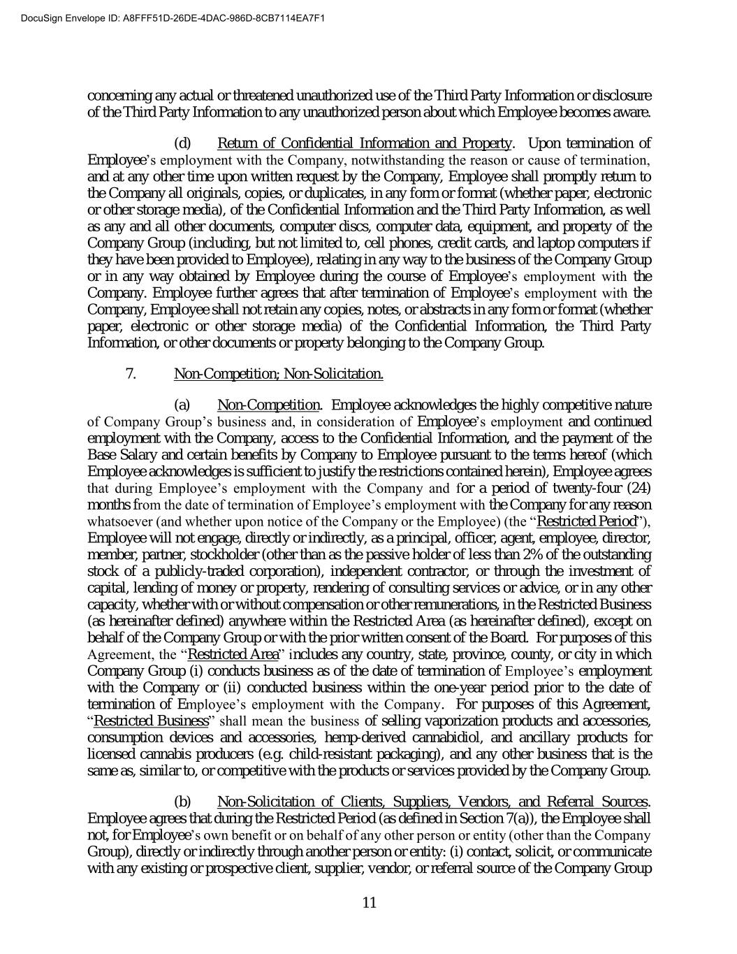 DocuSign Envelope ID: A8FFF51D-26DE-4DAC-986D-8CB7114EA7F1 concerning any actual or threatened unauthorized use of the Third Party Information or disclosure of the Third Party Information to any unauthorized person about which Employee becomes aware. (d) Return of Confidential Information and Property. Upon termination of Employee’s employment with the Company, notwithstanding the reason or cause of termination, and at any other time upon written request by the Company, Employee shall promptly return to the Company all originals, copies, or duplicates, in any form or format (whether paper, electronic or other storage media), of the Confidential Information and the Third Party Information, as well as any and all other documents, computer discs, computer data, equipment, and property of the Company Group (including, but not limited to, cell phones, credit cards, and laptop computers if they have been provided to Employee), relating in any way to the business of the Company Group or in any way obtained by Employee during the course of Employee’s employment with the Company. Employee further agrees that after termination of Employee’s employment with the Company, Employee shall not retain any copies, notes, or abstracts in any form or format (whether paper, electronic or other storage media) of the Confidential Information, the Third Party Information, or other documents or property belonging to the Company Group. 7. Non-Competition; Non-Solicitation. (a) Non-Competition. Employee acknowledges the highly competitive nature of Company Group’s business and, in consideration of Employee’s employment and continued employment with the Company, access to the Confidential Information, and the payment of the Base Salary and certain benefits by Company to Employee pursuant to the terms hereof (which Employee acknowledges is sufficient to justify the restrictions contained herein), Employee agrees that during Employee’s employment with the Company and for a period of twenty-four (24) months from the date of termination of Employee’s employment with the Company for any reason whatsoever (and whether upon notice of the Company or the Employee) (the “Restricted Period”), Employee will not engage, directly or indirectly, as a principal, officer, agent, employee, director, member, partner, stockholder (other than as the passive holder of less than 2% of the outstanding stock of a publicly-traded corporation), independent contractor, or through the investment of capital, lending of money or property, rendering of consulting services or advice, or in any other capacity, whether with or without compensation or other remunerations, in the Restricted Business (as hereinafter defined) anywhere within the Restricted Area (as hereinafter defined), except on behalf of the Company Group or with the prior written consent of the Board. For purposes of this Agreement, the “Restricted Area” includes any country, state, province, county, or city in which Company Group (i) conducts business as of the date of termination of Employee’s employment with the Company or (ii) conducted business within the one-year period prior to the date of termination of Employee’s employment with the Company. For purposes of this Agreement, “Restricted Business” shall mean the business of selling vaporization products and accessories, consumption devices and accessories, hemp-derived cannabidiol, and ancillary products for licensed cannabis producers (e.g. child-resistant packaging), and any other business that is the same as, similar to, or competitive with the products or services provided by the Company Group. (b) Non-Solicitation of Clients, Suppliers, Vendors, and Referral Sources. Employee agrees that during the Restricted Period (as defined in Section 7(a)), the Employee shall not, for Employee’s own benefit or on behalf of any other person or entity (other than the Company Group), directly or indirectly through another person or entity: (i) contact, solicit, or communicate with any existing or prospective client, supplier, vendor, or referral source of the Company Group 11