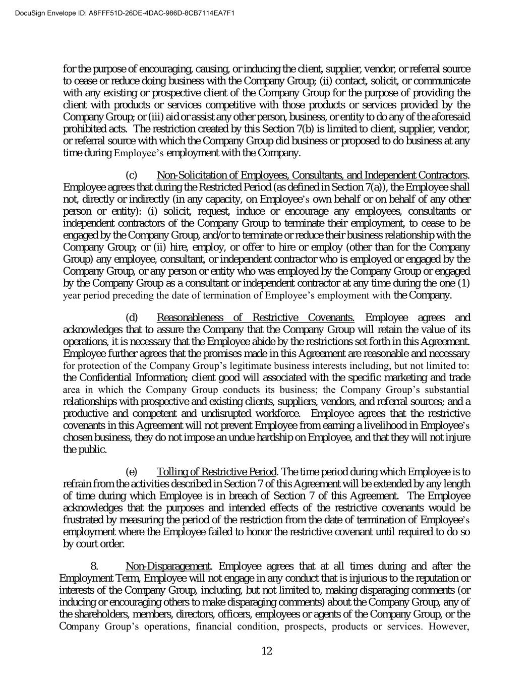 DocuSign Envelope ID: A8FFF51D-26DE-4DAC-986D-8CB7114EA7F1 for the purpose of encouraging, causing, or inducing the client, supplier, vendor, or referral source to cease or reduce doing business with the Company Group; (ii) contact, solicit, or communicate with any existing or prospective client of the Company Group for the purpose of providing the client with products or services competitive with those products or services provided by the Company Group; or (iii) aid or assist any other person, business, or entity to do any of the aforesaid prohibited acts. The restriction created by this Section 7(b) is limited to client, supplier, vendor, or referral source with which the Company Group did business or proposed to do business at any time during Employee’s employment with the Company. (c) Non-Solicitation of Employees, Consultants, and Independent Contractors. Employee agrees that during the Restricted Period (as defined in Section 7(a)), the Employee shall not, directly or indirectly (in any capacity, on Employee’s own behalf or on behalf of any other person or entity): (i) solicit, request, induce or encourage any employees, consultants or independent contractors of the Company Group to terminate their employment, to cease to be engaged by the Company Group, and/or to terminate or reduce their business relationship with the Company Group; or (ii) hire, employ, or offer to hire or employ (other than for the Company Group) any employee, consultant, or independent contractor who is employed or engaged by the Company Group, or any person or entity who was employed by the Company Group or engaged by the Company Group as a consultant or independent contractor at any time during the one (1) year period preceding the date of termination of Employee’s employment with the Company. (d) Reasonableness of Restrictive Covenants. Employee agrees and acknowledges that to assure the Company that the Company Group will retain the value of its operations, it is necessary that the Employee abide by the restrictions set forth in this Agreement. Employee further agrees that the promises made in this Agreement are reasonable and necessary for protection of the Company Group’s legitimate business interests including, but not limited to: the Confidential Information; client good will associated with the specific marketing and trade area in which the Company Group conducts its business; the Company Group’s substantial relationships with prospective and existing clients, suppliers, vendors, and referral sources; and a productive and competent and undisrupted workforce. Employee agrees that the restrictive covenants in this Agreement will not prevent Employee from earning a livelihood in Employee’s chosen business, they do not impose an undue hardship on Employee, and that they will not injure the public. (e) Tolling of Restrictive Period. The time period during which Employee is to refrain from the activities described in Section 7 of this Agreement will be extended by any length of time during which Employee is in breach of Section 7 of this Agreement. The Employee acknowledges that the purposes and intended effects of the restrictive covenants would be frustrated by measuring the period of the restriction from the date of termination of Employee’s employment where the Employee failed to honor the restrictive covenant until required to do so by court order. 8. Non-Disparagement. Employee agrees that at all times during and after the Employment Term, Employee will not engage in any conduct that is injurious to the reputation or interests of the Company Group, including, but not limited to, making disparaging comments (or inducing or encouraging others to make disparaging comments) about the Company Group, any of the shareholders, members, directors, officers, employees or agents of the Company Group, or the Company Group’s operations, financial condition, prospects, products or services. However, 12
