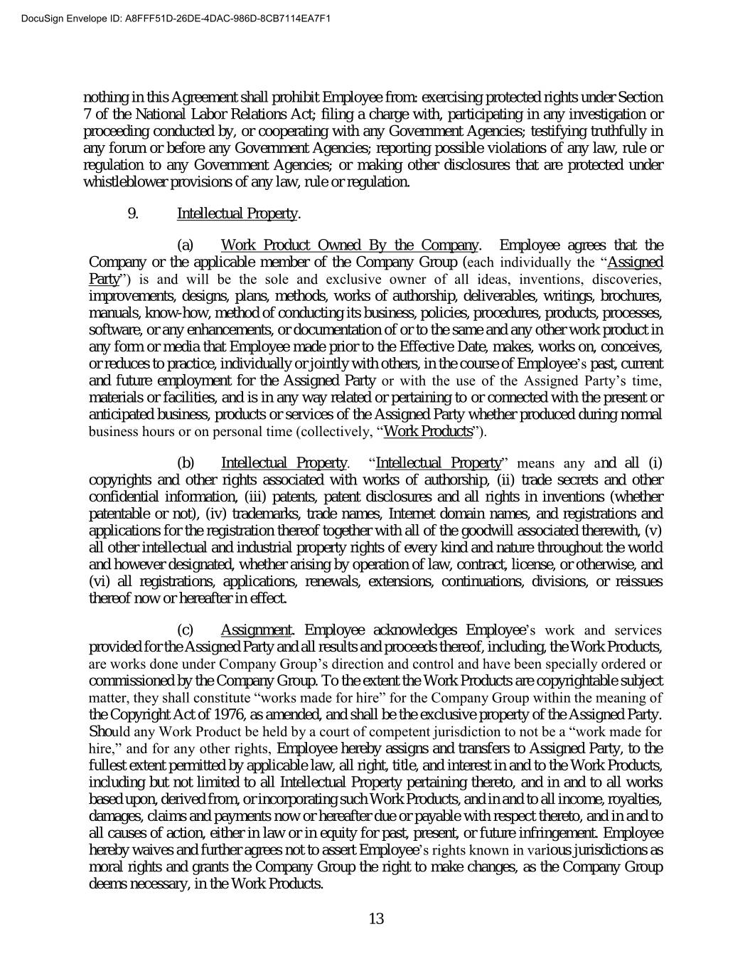 DocuSign Envelope ID: A8FFF51D-26DE-4DAC-986D-8CB7114EA7F1 nothing in this Agreement shall prohibit Employee from: exercising protected rights under Section 7 of the National Labor Relations Act; filing a charge with, participating in any investigation or proceeding conducted by, or cooperating with any Government Agencies; testifying truthfully in any forum or before any Government Agencies; reporting possible violations of any law, rule or regulation to any Government Agencies; or making other disclosures that are protected under whistleblower provisions of any law, rule or regulation. 9. Intellectual Property. (a) Work Product Owned By the Company. Employee agrees that the Company or the applicable member of the Company Group (each individually the “Assigned Party”) is and will be the sole and exclusive owner of all ideas, inventions, discoveries, improvements, designs, plans, methods, works of authorship, deliverables, writings, brochures, manuals, know-how, method of conducting its business, policies, procedures, products, processes, software, or any enhancements, or documentation of or to the same and any other work product in any form or media that Employee made prior to the Effective Date, makes, works on, conceives, or reduces to practice, individually or jointly with others, in the course of Employee’s past, current and future employment for the Assigned Party or with the use of the Assigned Party’s time, materials or facilities, and is in any way related or pertaining to or connected with the present or anticipated business, products or services of the Assigned Party whether produced during normal business hours or on personal time (collectively, “Work Products”). (b) Intellectual Property. “Intellectual Property” means any and all (i) copyrights and other rights associated with works of authorship, (ii) trade secrets and other confidential information, (iii) patents, patent disclosures and all rights in inventions (whether patentable or not), (iv) trademarks, trade names, Internet domain names, and registrations and applications for the registration thereof together with all of the goodwill associated therewith, (v) all other intellectual and industrial property rights of every kind and nature throughout the world and however designated, whether arising by operation of law, contract, license, or otherwise, and (vi) all registrations, applications, renewals, extensions, continuations, divisions, or reissues thereof now or hereafter in effect. (c) Assignment. Employee acknowledges Employee’s work and services provided for the Assigned Party and all results and proceeds thereof, including, the Work Products, are works done under Company Group’s direction and control and have been specially ordered or commissioned by the Company Group. To the extent the Work Products are copyrightable subject matter, they shall constitute “works made for hire” for the Company Group within the meaning of the Copyright Act of 1976, as amended, and shall be the exclusive property of the Assigned Party. Should any Work Product be held by a court of competent jurisdiction to not be a “work made for hire,” and for any other rights, Employee hereby assigns and transfers to Assigned Party, to the fullest extent permitted by applicable law, all right, title, and interest in and to the Work Products, including but not limited to all Intellectual Property pertaining thereto, and in and to all works based upon, derived from, or incorporating such Work Products, and in and to all income, royalties, damages, claims and payments now or hereafter due or payable with respect thereto, and in and to all causes of action, either in law or in equity for past, present, or future infringement. Employee hereby waives and further agrees not to assert Employee’s rights known in various jurisdictions as moral rights and grants the Company Group the right to make changes, as the Company Group deems necessary, in the Work Products. 13
