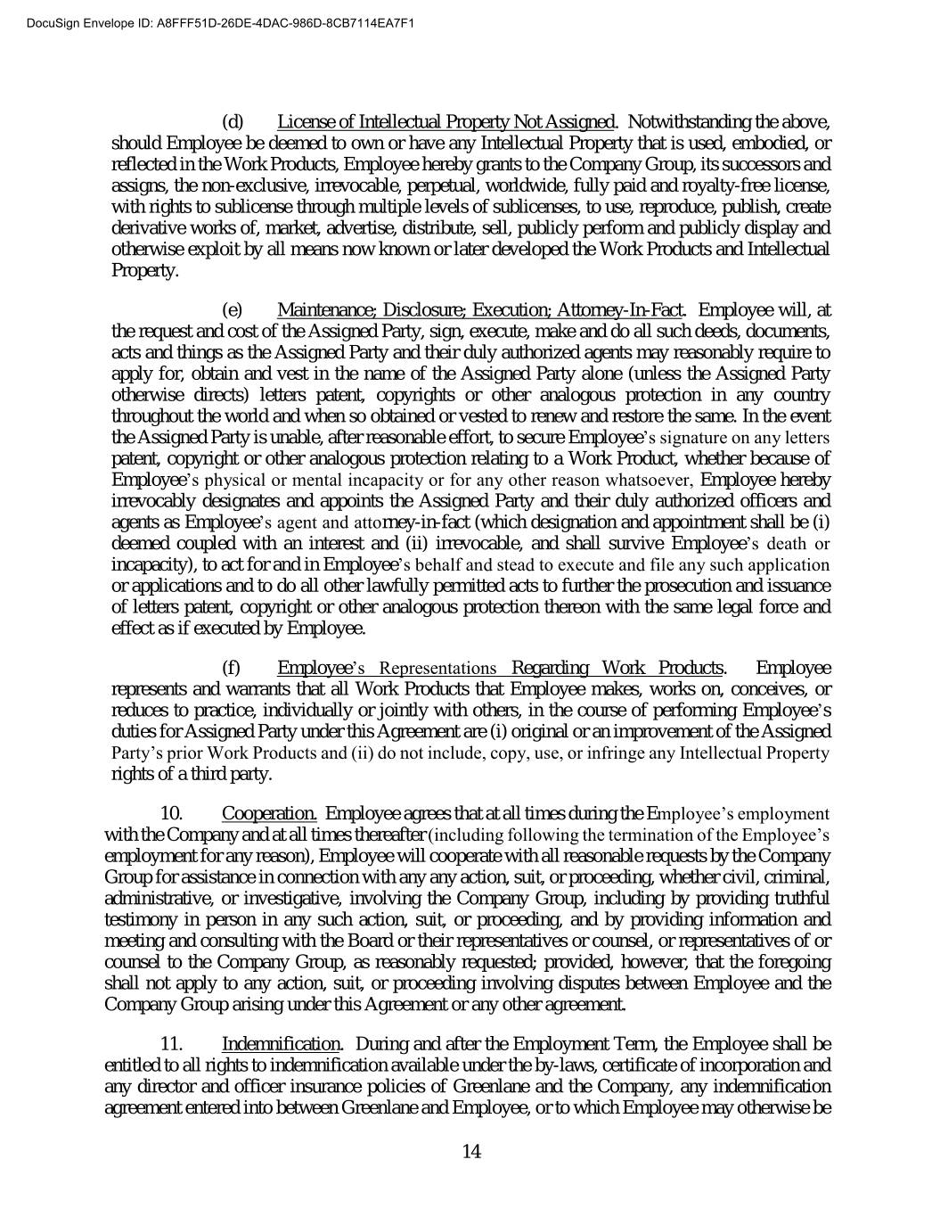 DocuSign Envelope ID: A8FFF51D-26DE-4DAC-986D-8CB7114EA7F1 (d) License of Intellectual Property Not Assigned. Notwithstanding the above, should Employee be deemed to own or have any Intellectual Property that is used, embodied, or reflected in the Work Products, Employee hereby grants to the Company Group, its successors and assigns, the non-exclusive, irrevocable, perpetual, worldwide, fully paid and royalty-free license, with rights to sublicense through multiple levels of sublicenses, to use, reproduce, publish, create derivative works of, market, advertise, distribute, sell, publicly perform and publicly display and otherwise exploit by all means now known or later developed the Work Products and Intellectual Property. (e) Maintenance; Disclosure; Execution; Attorney-In-Fact. Employee will, at the request and cost of the Assigned Party, sign, execute, make and do all such deeds, documents, acts and things as the Assigned Party and their duly authorized agents may reasonably require to apply for, obtain and vest in the name of the Assigned Party alone (unless the Assigned Party otherwise directs) letters patent, copyrights or other analogous protection in any country throughout the world and when so obtained or vested to renew and restore the same. In the event the Assigned Party is unable, after reasonable effort, to secure Employee’s signature on any letters patent, copyright or other analogous protection relating to a Work Product, whether because of Employee’s physical or mental incapacity or for any other reason whatsoever, Employee hereby irrevocably designates and appoints the Assigned Party and their duly authorized officers and agents as Employee’s agent and attorney-in-fact (which designation and appointment shall be (i) deemed coupled with an interest and (ii) irrevocable, and shall survive Employee’s death or incapacity), to act for and in Employee’s behalf and stead to execute and file any such application or applications and to do all other lawfully permitted acts to further the prosecution and issuance of letters patent, copyright or other analogous protection thereon with the same legal force and effect as if executed by Employee. (f) Employee’s Representations Regarding Work Products. Employee represents and warrants that all Work Products that Employee makes, works on, conceives, or reduces to practice, individually or jointly with others, in the course of performing Employee’s duties for Assigned Party under this Agreement are (i) original or an improvement of the Assigned Party’s prior Work Products and (ii) do not include, copy, use, or infringe any Intellectual Property rights of a third party. 10. Cooperation. Employee agrees that at all times during the Employee’s employment with the Company and at all times thereafter (including following the termination of the Employee’s employment for any reason), Employee will cooperate with all reasonable requests by the Company Group for assistance in connection with any any action, suit, or proceeding, whether civil, criminal, administrative, or investigative, involving the Company Group, including by providing truthful testimony in person in any such action, suit, or proceeding, and by providing information and meeting and consulting with the Board or their representatives or counsel, or representatives of or counsel to the Company Group, as reasonably requested; provided, however, that the foregoing shall not apply to any action, suit, or proceeding involving disputes between Employee and the Company Group arising under this Agreement or any other agreement. 11. Indemnification. During and after the Employment Term, the Employee shall be entitled to all rights to indemnification available under the by-laws, certificate of incorporation and any director and officer insurance policies of Greenlane and the Company, any indemnification agreement entered into between Greenlane and Employee, or to which Employee may otherwise be 14
