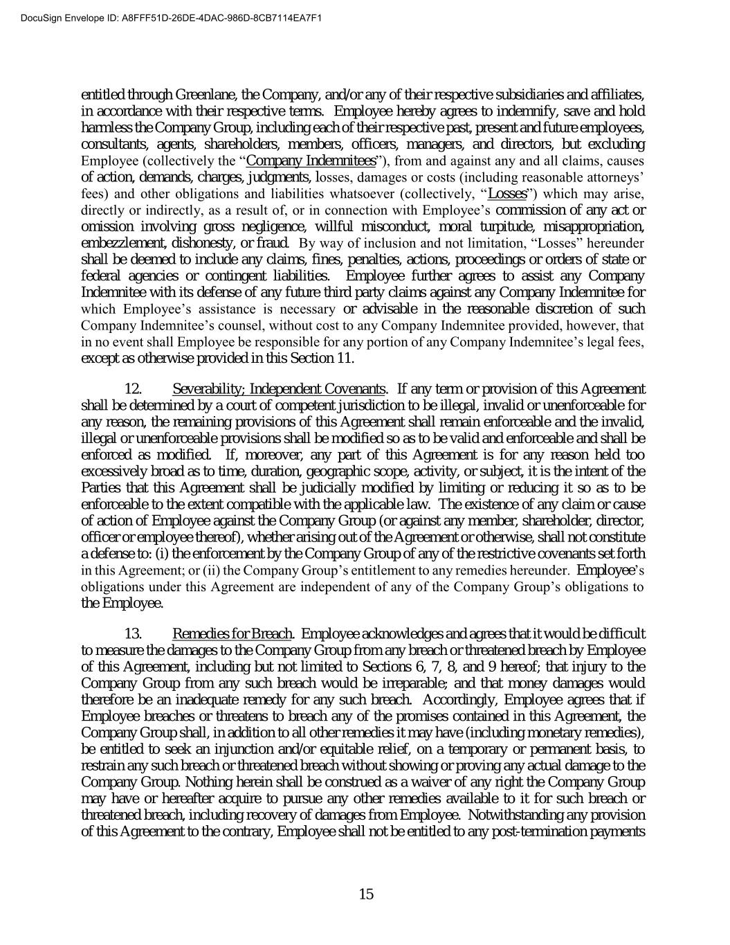 DocuSign Envelope ID: A8FFF51D-26DE-4DAC-986D-8CB7114EA7F1 entitled through Greenlane, the Company, and/or any of their respective subsidiaries and affiliates, in accordance with their respective terms. Employee hereby agrees to indemnify, save and hold harmless the Company Group, including each of their respective past, present and future employees, consultants, agents, shareholders, members, officers, managers, and directors, but excluding Employee (collectively the “Company Indemnitees”), from and against any and all claims, causes of action, demands, charges, judgments, losses, damages or costs (including reasonable attorneys’ fees) and other obligations and liabilities whatsoever (collectively, “Losses”) which may arise, directly or indirectly, as a result of, or in connection with Employee’s commission of any act or omission involving gross negligence, willful misconduct, moral turpitude, misappropriation, embezzlement, dishonesty, or fraud. By way of inclusion and not limitation, “Losses” hereunder shall be deemed to include any claims, fines, penalties, actions, proceedings or orders of state or federal agencies or contingent liabilities. Employee further agrees to assist any Company Indemnitee with its defense of any future third party claims against any Company Indemnitee for which Employee’s assistance is necessary or advisable in the reasonable discretion of such Company Indemnitee’s counsel, without cost to any Company Indemnitee provided, however, that in no event shall Employee be responsible for any portion of any Company Indemnitee’s legal fees, except as otherwise provided in this Section 11. 12. Severability; Independent Covenants. If any term or provision of this Agreement shall be determined by a court of competent jurisdiction to be illegal, invalid or unenforceable for any reason, the remaining provisions of this Agreement shall remain enforceable and the invalid, illegal or unenforceable provisions shall be modified so as to be valid and enforceable and shall be enforced as modified. If, moreover, any part of this Agreement is for any reason held too excessively broad as to time, duration, geographic scope, activity, or subject, it is the intent of the Parties that this Agreement shall be judicially modified by limiting or reducing it so as to be enforceable to the extent compatible with the applicable law. The existence of any claim or cause of action of Employee against the Company Group (or against any member, shareholder, director, officer or employee thereof), whether arising out of the Agreement or otherwise, shall not constitute a defense to: (i) the enforcement by the Company Group of any of the restrictive covenants set forth in this Agreement; or (ii) the Company Group’s entitlement to any remedies hereunder. Employee’s obligations under this Agreement are independent of any of the Company Group’s obligations to the Employee. 13. Remedies for Breach. Employee acknowledges and agrees that it would be difficult to measure the damages to the Company Group from any breach or threatened breach by Employee of this Agreement, including but not limited to Sections 6, 7, 8, and 9 hereof; that injury to the Company Group from any such breach would be irreparable; and that money damages would therefore be an inadequate remedy for any such breach. Accordingly, Employee agrees that if Employee breaches or threatens to breach any of the promises contained in this Agreement, the Company Group shall, in addition to all other remedies it may have (including monetary remedies), be entitled to seek an injunction and/or equitable relief, on a temporary or permanent basis, to restrain any such breach or threatened breach without showing or proving any actual damage to the Company Group. Nothing herein shall be construed as a waiver of any right the Company Group may have or hereafter acquire to pursue any other remedies available to it for such breach or threatened breach, including recovery of damages from Employee. Notwithstanding any provision of this Agreement to the contrary, Employee shall not be entitled to any post-termination payments 15