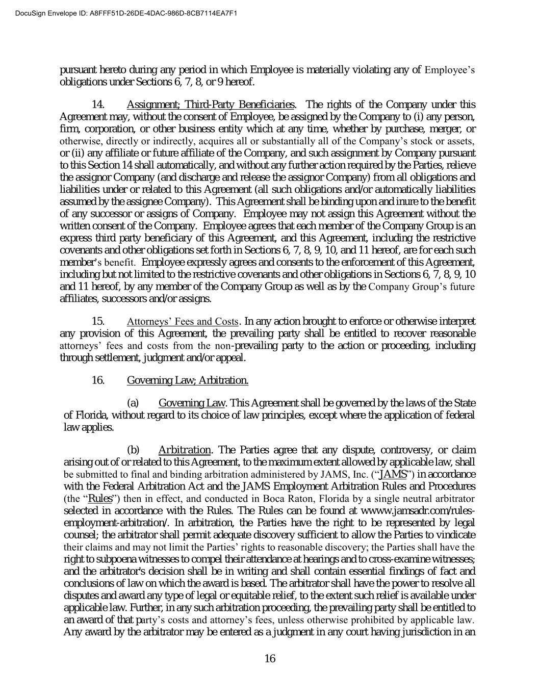 DocuSign Envelope ID: A8FFF51D-26DE-4DAC-986D-8CB7114EA7F1 pursuant hereto during any period in which Employee is materially violating any of Employee’s obligations under Sections 6, 7, 8, or 9 hereof. 14. Assignment; Third-Party Beneficiaries. The rights of the Company under this Agreement may, without the consent of Employee, be assigned by the Company to (i) any person, firm, corporation, or other business entity which at any time, whether by purchase, merger, or otherwise, directly or indirectly, acquires all or substantially all of the Company’s stock or assets, or (ii) any affiliate or future affiliate of the Company, and such assignment by Company pursuant to this Section 14 shall automatically, and without any further action required by the Parties, relieve the assignor Company (and discharge and release the assignor Company) from all obligations and liabilities under or related to this Agreement (all such obligations and/or automatically liabilities assumed by the assignee Company). This Agreement shall be binding upon and inure to the benefit of any successor or assigns of Company. Employee may not assign this Agreement without the written consent of the Company. Employee agrees that each member of the Company Group is an express third party beneficiary of this Agreement, and this Agreement, including the restrictive covenants and other obligations set forth in Sections 6, 7, 8, 9, 10, and 11 hereof, are for each such member’s benefit. Employee expressly agrees and consents to the enforcement of this Agreement, including but not limited to the restrictive covenants and other obligations in Sections 6, 7, 8, 9, 10 and 11 hereof, by any member of the Company Group as well as by the Company Group’s future affiliates, successors and/or assigns. 15. Attorneys’ Fees and Costs. In any action brought to enforce or otherwise interpret any provision of this Agreement, the prevailing party shall be entitled to recover reasonable attorneys’ fees and costs from the non-prevailing party to the action or proceeding, including through settlement, judgment and/or appeal. 16. Governing Law; Arbitration. (a) Governing Law. This Agreement shall be governed by the laws of the State of Florida, without regard to its choice of law principles, except where the application of federal law applies. (b) Arbitration. The Parties agree that any dispute, controversy, or claim arising out of or related to this Agreement, to the maximum extent allowed by applicable law, shall be submitted to final and binding arbitration administered by JAMS, Inc. (“JAMS”) in accordance with the Federal Arbitration Act and the JAMS Employment Arbitration Rules and Procedures (the “Rules”) then in effect, and conducted in Boca Raton, Florida by a single neutral arbitrator selected in accordance with the Rules. The Rules can be found at wwww.jamsadr.com/rules- employment-arbitration/. In arbitration, the Parties have the right to be represented by legal counsel; the arbitrator shall permit adequate discovery sufficient to allow the Parties to vindicate their claims and may not limit the Parties’ rights to reasonable discovery; the Parties shall have the right to subpoena witnesses to compel their attendance at hearings and to cross-examine witnesses; and the arbitrator's decision shall be in writing and shall contain essential findings of fact and conclusions of law on which the award is based. The arbitrator shall have the power to resolve all disputes and award any type of legal or equitable relief, to the extent such relief is available under applicable law. Further, in any such arbitration proceeding, the prevailing party shall be entitled to an award of that party’s costs and attorney’s fees, unless otherwise prohibited by applicable law. Any award by the arbitrator may be entered as a judgment in any court having jurisdiction in an 16