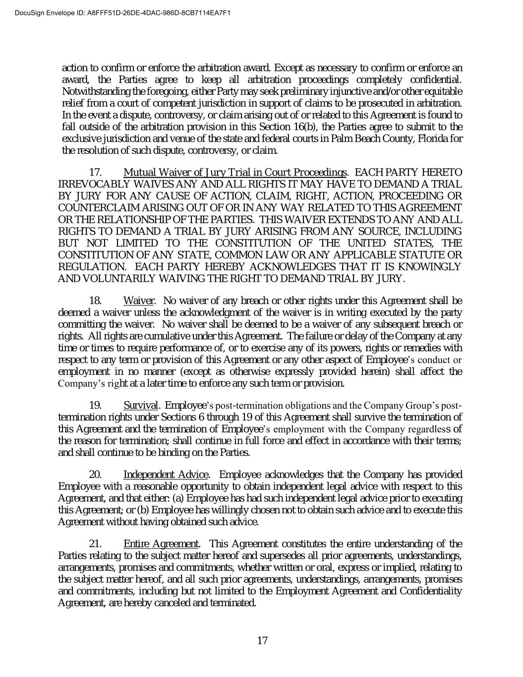 DocuSign Envelope ID: A8FFF51D-26DE-4DAC-986D-8CB7114EA7F1 action to confirm or enforce the arbitration award. Except as necessary to confirm or enforce an award, the Parties agree to keep all arbitration proceedings completely confidential. Notwithstanding the foregoing, either Party may seek preliminary injunctive and/or other equitable relief from a court of competent jurisdiction in support of claims to be prosecuted in arbitration. In the event a dispute, controversy, or claim arising out of or related to this Agreement is found to fall outside of the arbitration provision in this Section 16(b), the Parties agree to submit to the exclusive jurisdiction and venue of the state and federal courts in Palm Beach County, Florida for the resolution of such dispute, controversy, or claim. 17. Mutual Waiver of Jury Trial in Court Proceedings. EACH PARTY HERETO IRREVOCABLY WAIVES ANY AND ALL RIGHTS IT MAY HAVE TO DEMAND A TRIAL BY JURY FOR ANY CAUSE OF ACTION, CLAIM, RIGHT, ACTION, PROCEEDING OR COUNTERCLAIM ARISING OUT OF OR IN ANY WAY RELATED TO THIS AGREEMENT OR THE RELATIONSHIP OF THE PARTIES. THIS WAIVER EXTENDS TO ANY AND ALL RIGHTS TO DEMAND A TRIAL BY JURY ARISING FROM ANY SOURCE, INCLUDING BUT NOT LIMITED TO THE CONSTITUTION OF THE UNITED STATES, THE CONSTITUTION OF ANY STATE, COMMON LAW OR ANY APPLICABLE STATUTE OR REGULATION. EACH PARTY HEREBY ACKNOWLEDGES THAT IT IS KNOWINGLY AND VOLUNTARILY WAIVING THE RIGHT TO DEMAND TRIAL BY JURY. 18. Waiver. No waiver of any breach or other rights under this Agreement shall be deemed a waiver unless the acknowledgment of the waiver is in writing executed by the party committing the waiver. No waiver shall be deemed to be a waiver of any subsequent breach or rights. All rights are cumulative under this Agreement. The failure or delay of the Company at any time or times to require performance of, or to exercise any of its powers, rights or remedies with respect to any term or provision of this Agreement or any other aspect of Employee’s conduct or employment in no manner (except as otherwise expressly provided herein) shall affect the Company’s right at a later time to enforce any such term or provision. 19. Survival. Employee’s post-termination obligations and the Company Group’s post- termination rights under Sections 6 through 19 of this Agreement shall survive the termination of this Agreement and the termination of Employee’s employment with the Company regardless of the reason for termination; shall continue in full force and effect in accordance with their terms; and shall continue to be binding on the Parties. 20. Independent Advice. Employee acknowledges that the Company has provided Employee with a reasonable opportunity to obtain independent legal advice with respect to this Agreement, and that either: (a) Employee has had such independent legal advice prior to executing this Agreement; or (b) Employee has willingly chosen not to obtain such advice and to execute this Agreement without having obtained such advice. 21. Entire Agreement. This Agreement constitutes the entire understanding of the Parties relating to the subject matter hereof and supersedes all prior agreements, understandings, arrangements, promises and commitments, whether written or oral, express or implied, relating to the subject matter hereof, and all such prior agreements, understandings, arrangements, promises and commitments, including but not limited to the Employment Agreement and Confidentiality Agreement, are hereby canceled and terminated. 17