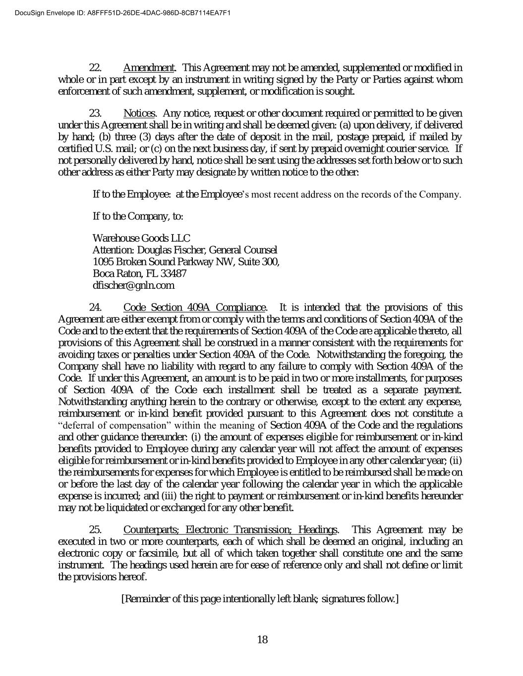 DocuSign Envelope ID: A8FFF51D-26DE-4DAC-986D-8CB7114EA7F1 22. Amendment. This Agreement may not be amended, supplemented or modified in whole or in part except by an instrument in writing signed by the Party or Parties against whom enforcement of such amendment, supplement, or modification is sought. 23. Notices. Any notice, request or other document required or permitted to be given under this Agreement shall be in writing and shall be deemed given: (a) upon delivery, if delivered by hand; (b) three (3) days after the date of deposit in the mail, postage prepaid, if mailed by certified U.S. mail; or (c) on the next business day, if sent by prepaid overnight courier service. If not personally delivered by hand, notice shall be sent using the addresses set forth below or to such other address as either Party may designate by written notice to the other: If to the Employee: at the Employee’s most recent address on the records of the Company. If to the Company, to: Warehouse Goods LLC Attention: Douglas Fischer, General Counsel 1095 Broken Sound Parkway NW, Suite 300, Boca Raton, FL 33487 dfischer@gnln.com 24. Code Section 409A Compliance. It is intended that the provisions of this Agreement are either exempt from or comply with the terms and conditions of Section 409A of the Code and to the extent that the requirements of Section 409A of the Code are applicable thereto, all provisions of this Agreement shall be construed in a manner consistent with the requirements for avoiding taxes or penalties under Section 409A of the Code. Notwithstanding the foregoing, the Company shall have no liability with regard to any failure to comply with Section 409A of the Code. If under this Agreement, an amount is to be paid in two or more installments, for purposes of Section 409A of the Code each installment shall be treated as a separate payment. Notwithstanding anything herein to the contrary or otherwise, except to the extent any expense, reimbursement or in-kind benefit provided pursuant to this Agreement does not constitute a “deferral of compensation” within the meaning of Section 409A of the Code and the regulations and other guidance thereunder: (i) the amount of expenses eligible for reimbursement or in-kind benefits provided to Employee during any calendar year will not affect the amount of expenses eligible for reimbursement or in-kind benefits provided to Employee in any other calendar year; (ii) the reimbursements for expenses for which Employee is entitled to be reimbursed shall be made on or before the last day of the calendar year following the calendar year in which the applicable expense is incurred; and (iii) the right to payment or reimbursement or in-kind benefits hereunder may not be liquidated or exchanged for any other benefit. 25. Counterparts; Electronic Transmission; Headings. This Agreement may be executed in two or more counterparts, each of which shall be deemed an original, including an electronic copy or facsimile, but all of which taken together shall constitute one and the same instrument. The headings used herein are for ease of reference only and shall not define or limit the provisions hereof. [Remainder of this page intentionally left blank; signatures follow.] 18
