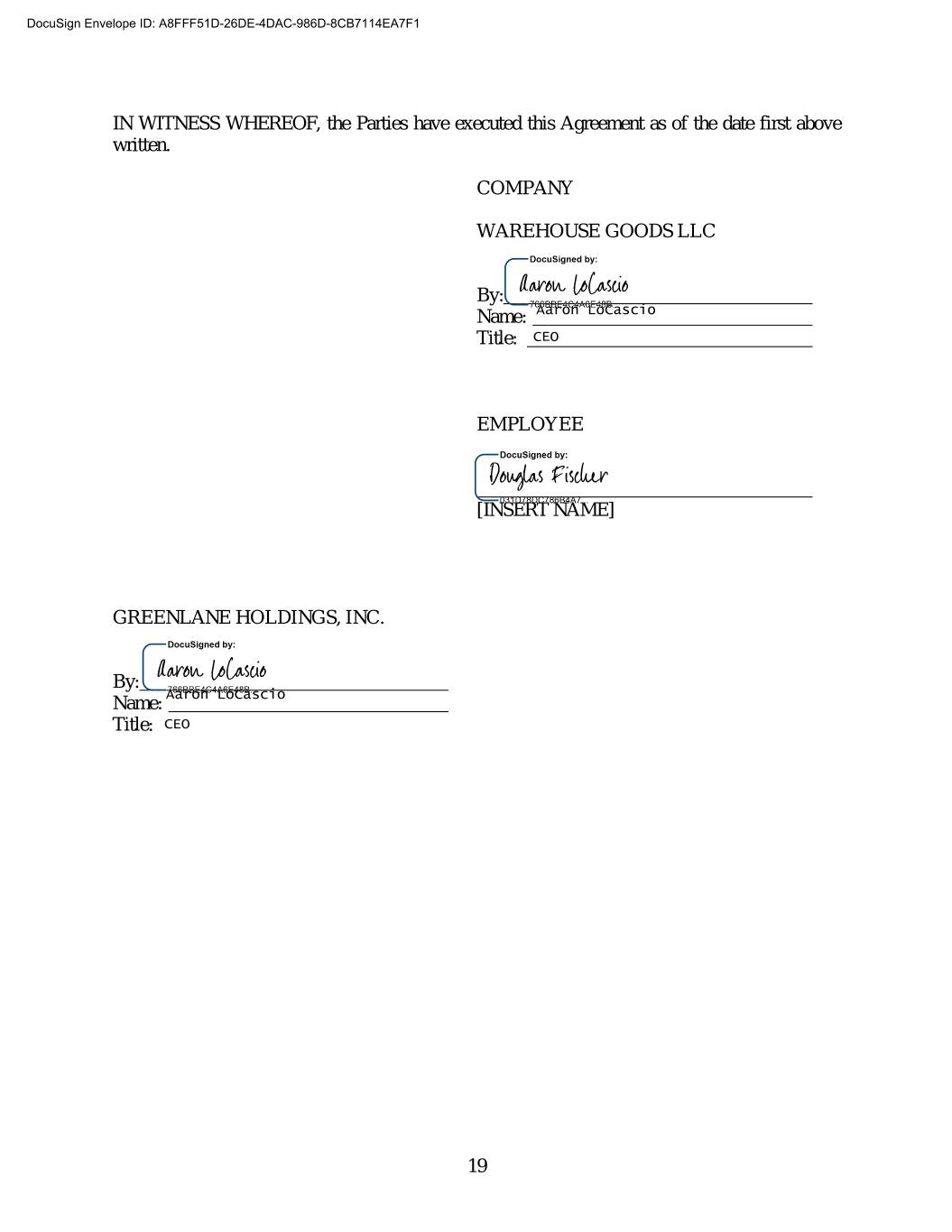 DocuSign Envelope ID: A8FFF51D-26DE-4DAC-986D-8CB7114EA7F1 IN WITNESS WHEREOF, the Parties have executed this Agreement as of the date first above written. COMPANY WAREHOUSE GOODS LLC By: Name: Aaron LoCascio Title: CEO EMPLOYEE [INSERT NAME] GREENLANE HOLDINGS, INC. By: Name: Aaron LoCascio Title: CEO 19