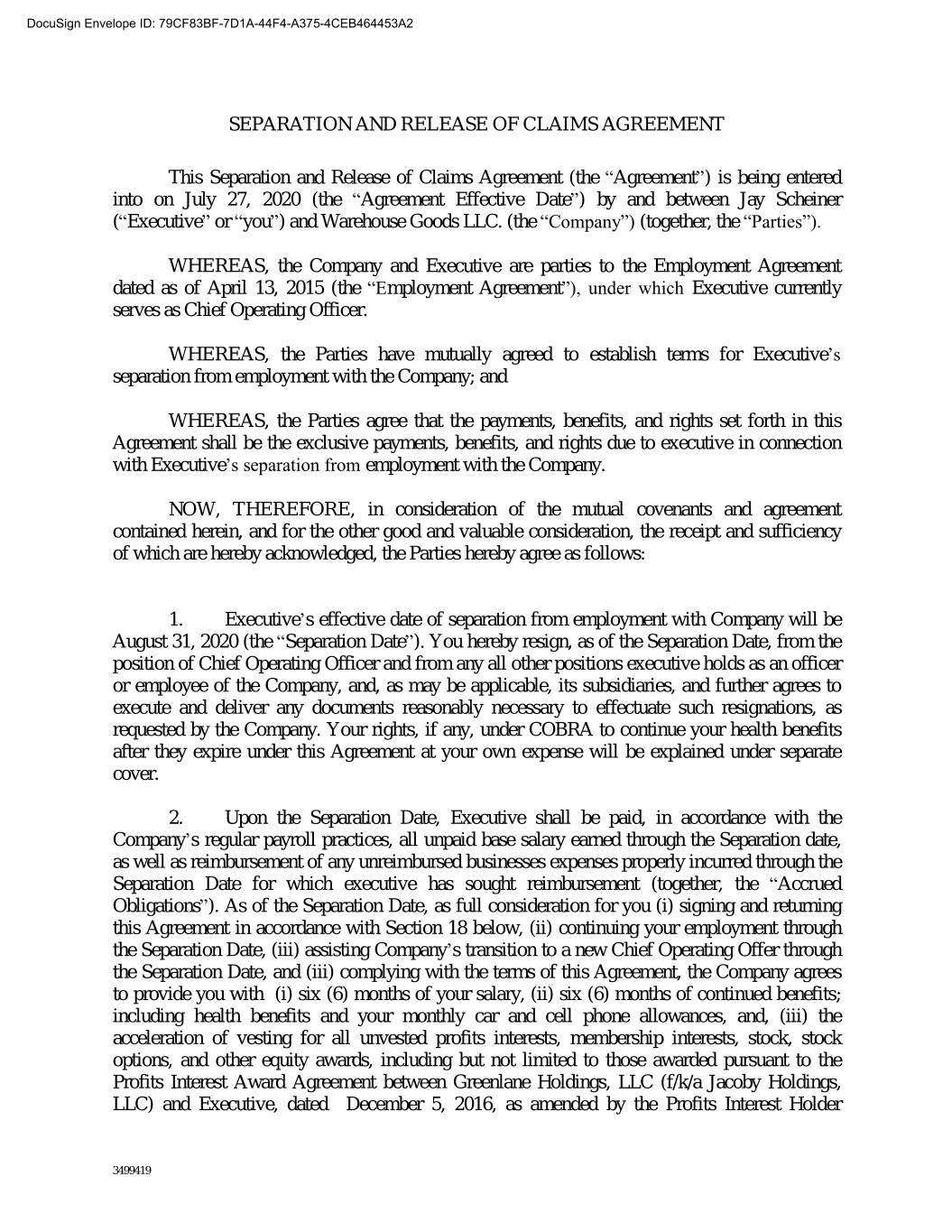 DocuSign Envelope ID: 79CF83BF-7D1A-44F4-A375-4CEB464453A2 SEPARATION AND RELEASE OF CLAIMS AGREEMENT This Separation and Release of Claims Agreement (the “Agreement”) is being entered into on July 27, 2020 (the “Agreement Effective Date”) by and between Jay Scheiner (“Executive” or “you”) and Warehouse Goods LLC. (the “Company”) (together, the “Parties”). WHEREAS, the Company and Executive are parties to the Employment Agreement dated as of April 13, 2015 (the “Employment Agreement”), under which Executive currently serves as Chief Operating Officer. WHEREAS, the Parties have mutually agreed to establish terms for Executive’s separation from employment with the Company; and WHEREAS, the Parties agree that the payments, benefits, and rights set forth in this Agreement shall be the exclusive payments, benefits, and rights due to executive in connection with Executive’s separation from employment with the Company. NOW, THEREFORE, in consideration of the mutual covenants and agreement contained herein, and for the other good and valuable consideration, the receipt and sufficiency of which are hereby acknowledged, the Parties hereby agree as follows: 1. Executive’s effective date of separation from employment with Company will be August 31, 2020 (the “Separation Date”). You hereby resign, as of the Separation Date, from the position of Chief Operating Officer and from any all other positions executive holds as an officer or employee of the Company, and, as may be applicable, its subsidiaries, and further agrees to execute and deliver any documents reasonably necessary to effectuate such resignations, as requested by the Company. Your rights, if any, under COBRA to continue your health benefits after they expire under this Agreement at your own expense will be explained under separate cover. 2. Upon the Separation Date, Executive shall be paid, in accordance with the Company’s regular payroll practices, all unpaid base salary earned through the Separation date, as well as reimbursement of any unreimbursed businesses expenses properly incurred through the Separation Date for which executive has sought reimbursement (together, the “Accrued Obligations”). As of the Separation Date, as full consideration for you (i) signing and returning this Agreement in accordance with Section 18 below, (ii) continuing your employment through the Separation Date, (iii) assisting Company’s transition to a new Chief Operating Offer through the Separation Date, and (iii) complying with the terms of this Agreement, the Company agrees to provide you with (i) six (6) months of your salary, (ii) six (6) months of continued benefits; including health benefits and your monthly car and cell phone allowances, and, (iii) the acceleration of vesting for all unvested profits interests, membership interests, stock, stock options, and other equity awards, including but not limited to those awarded pursuant to the Profits Interest Award Agreement between Greenlane Holdings, LLC (f/k/a Jacoby Holdings, LLC) and Executive, dated December 5, 2016, as amended by the Profits Interest Holder 3499419