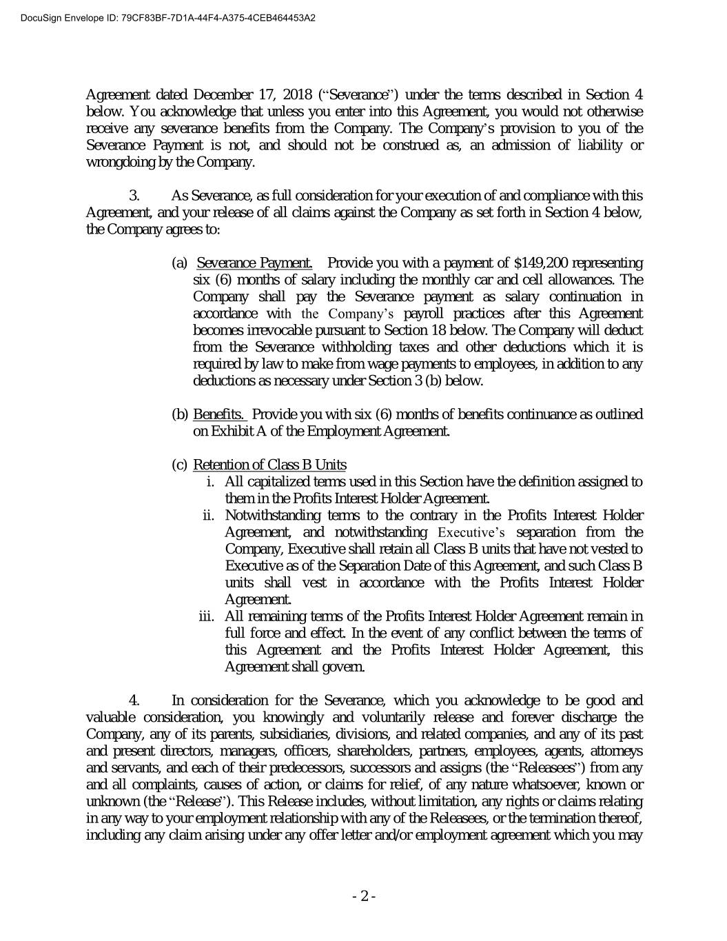 DocuSign Envelope ID: 79CF83BF-7D1A-44F4-A375-4CEB464453A2 Agreement dated December 17, 2018 (“Severance”) under the terms described in Section 4 below. You acknowledge that unless you enter into this Agreement, you would not otherwise receive any severance benefits from the Company. The Company’s provision to you of the Severance Payment is not, and should not be construed as, an admission of liability or wrongdoing by the Company. 3. As Severance, as full consideration for your execution of and compliance with this Agreement, and your release of all claims against the Company as set forth in Section 4 below, the Company agrees to: (a) Severance Payment. Provide you with a payment of $149,200 representing six (6) months of salary including the monthly car and cell allowances. The Company shall pay the Severance payment as salary continuation in accordance with the Company’s payroll practices after this Agreement becomes irrevocable pursuant to Section 18 below. The Company will deduct from the Severance withholding taxes and other deductions which it is required by law to make from wage payments to employees, in addition to any deductions as necessary under Section 3 (b) below. (b) Benefits. Provide you with six (6) months of benefits continuance as outlined on Exhibit A of the Employment Agreement. (c) Retention of Class B Units i. All capitalized terms used in this Section have the definition assigned to them in the Profits Interest Holder Agreement. ii. Notwithstanding terms to the contrary in the Profits Interest Holder Agreement, and notwithstanding Executive’s separation from the Company, Executive shall retain all Class B units that have not vested to Executive as of the Separation Date of this Agreement, and such Class B units shall vest in accordance with the Profits Interest Holder Agreement. iii. All remaining terms of the Profits Interest Holder Agreement remain in full force and effect. In the event of any conflict between the terms of this Agreement and the Profits Interest Holder Agreement, this Agreement shall govern. 4. In consideration for the Severance, which you acknowledge to be good and valuable consideration, you knowingly and voluntarily release and forever discharge the Company, any of its parents, subsidiaries, divisions, and related companies, and any of its past and present directors, managers, officers, shareholders, partners, employees, agents, attorneys and servants, and each of their predecessors, successors and assigns (the “Releasees”) from any and all complaints, causes of action, or claims for relief, of any nature whatsoever, known or unknown (the “Release”). This Release includes, without limitation, any rights or claims relating in any way to your employment relationship with any of the Releasees, or the termination thereof, including any claim arising under any offer letter and/or employment agreement which you may - 2 -