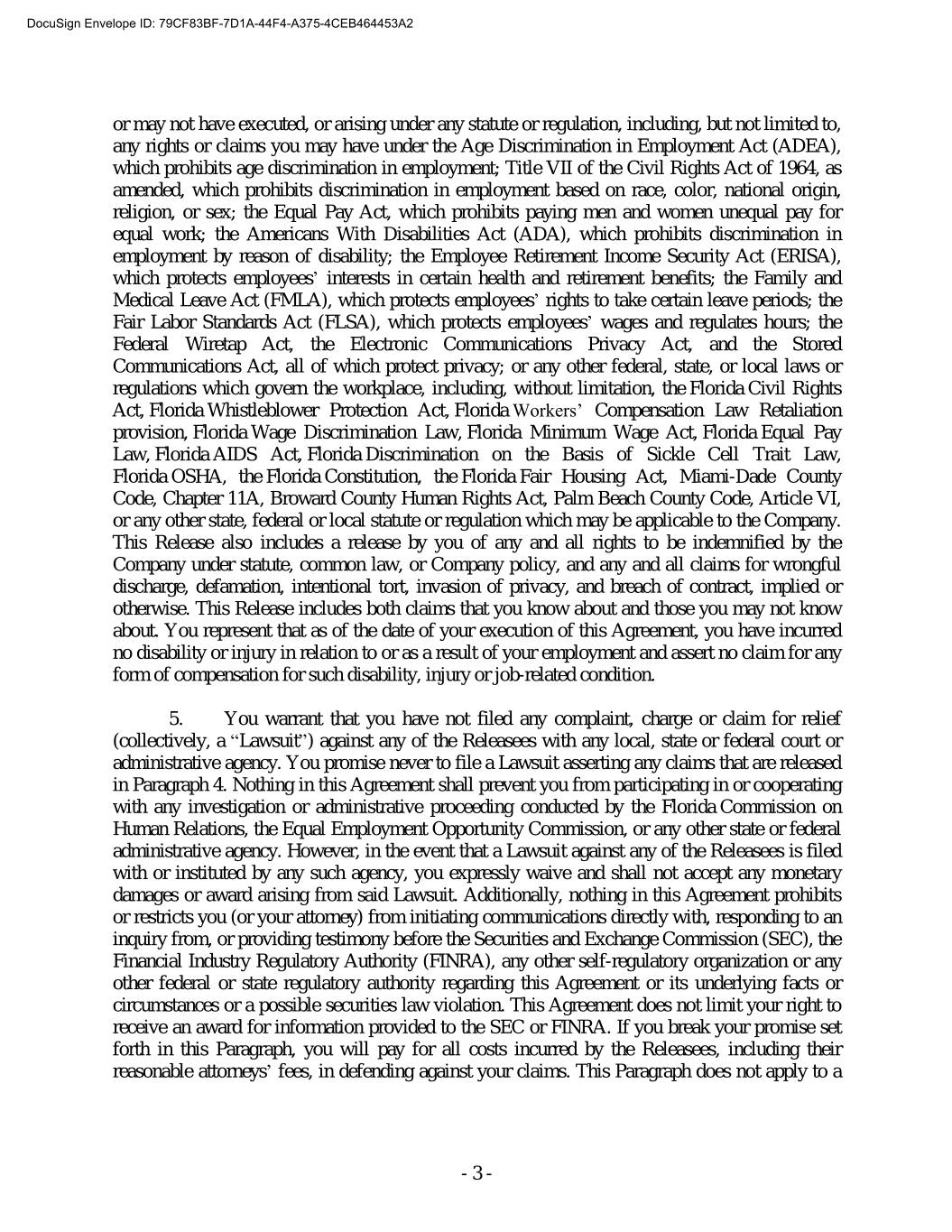 DocuSign Envelope ID: 79CF83BF-7D1A-44F4-A375-4CEB464453A2 or may not have executed, or arising under any statute or regulation, including, but not limited to, any rights or claims you may have under the Age Discrimination in Employment Act (ADEA), which prohibits age discrimination in employment; Title VII of the Civil Rights Act of 1964, as amended, which prohibits discrimination in employment based on race, color, national origin, religion, or sex; the Equal Pay Act, which prohibits paying men and women unequal pay for equal work; the Americans With Disabilities Act (ADA), which prohibits discrimination in employment by reason of disability; the Employee Retirement Income Security Act (ERISA), which protects employees’ interests in certain health and retirement benefits; the Family and Medical Leave Act (FMLA), which protects employees’ rights to take certain leave periods; the Fair Labor Standards Act (FLSA), which protects employees’ wages and regulates hours; the Federal Wiretap Act, the Electronic Communications Privacy Act, and the Stored Communications Act, all of which protect privacy; or any other federal, state, or local laws or regulations which govern the workplace, including, without limitation, the Florida Civil Rights Act, Florida Whistleblower Protection Act, Florida Workers’ Compensation Law Retaliation provision, Florida Wage Discrimination Law, Florida Minimum Wage Act, Florida Equal Pay Law, Florida AIDS Act, Florida Discrimination on the Basis of Sickle Cell Trait Law, Florida OSHA, the Florida Constitution, the Florida Fair Housing Act, Miami-Dade County Code, Chapter 11A, Broward County Human Rights Act, Palm Beach County Code, Article VI, or any other state, federal or local statute or regulation which may be applicable to the Company. This Release also includes a release by you of any and all rights to be indemnified by the Company under statute, common law, or Company policy, and any and all claims for wrongful discharge, defamation, intentional tort, invasion of privacy, and breach of contract, implied or otherwise. This Release includes both claims that you know about and those you may not know about. You represent that as of the date of your execution of this Agreement, you have incurred no disability or injury in relation to or as a result of your employment and assert no claim for any form of compensation for such disability, injury or job-related condition. 5. You warrant that you have not filed any complaint, charge or claim for relief (collectively, a “Lawsuit”) against any of the Releasees with any local, state or federal court or administrative agency. You promise never to file a Lawsuit asserting any claims that are released in Paragraph 4. Nothing in this Agreement shall prevent you from participating in or cooperating with any investigation or administrative proceeding conducted by the Florida Commission on Human Relations, the Equal Employment Opportunity Commission, or any other state or federal administrative agency. However, in the event that a Lawsuit against any of the Releasees is filed with or instituted by any such agency, you expressly waive and shall not accept any monetary damages or award arising from said Lawsuit. Additionally, nothing in this Agreement prohibits or restricts you (or your attorney) from initiating communications directly with, responding to an inquiry from, or providing testimony before the Securities and Exchange Commission (SEC), the Financial Industry Regulatory Authority (FINRA), any other self-regulatory organization or any other federal or state regulatory authority regarding this Agreement or its underlying facts or circumstances or a possible securities law violation. This Agreement does not limit your right to receive an award for information provided to the SEC or FINRA. If you break your promise set forth in this Paragraph, you will pay for all costs incurred by the Releasees, including their reasonable attorneys’ fees, in defending against your claims. This Paragraph does not apply to a - 3 -