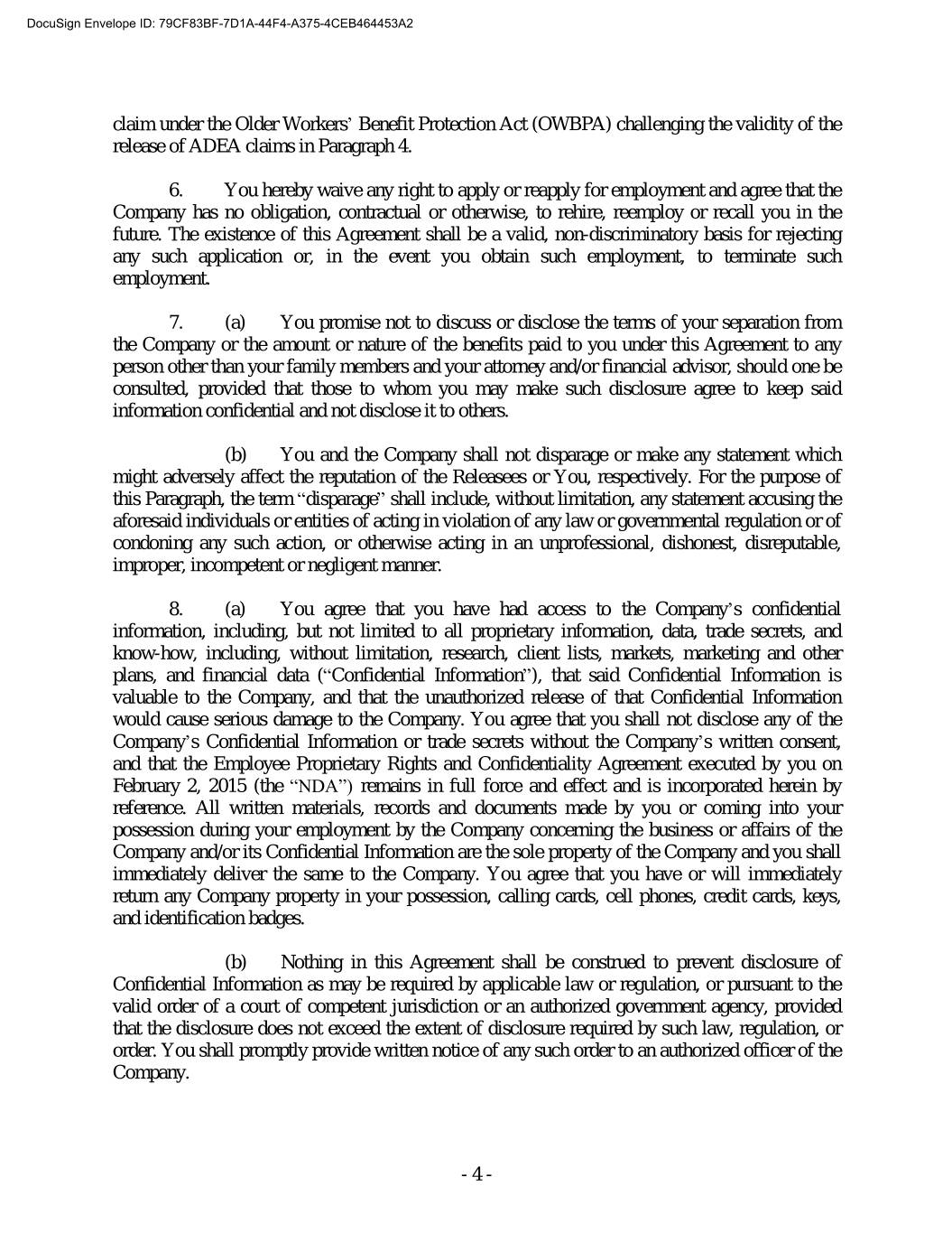 DocuSign Envelope ID: 79CF83BF-7D1A-44F4-A375-4CEB464453A2 claim under the Older Workers’ Benefit Protection Act (OWBPA) challenging the validity of the release of ADEA claims in Paragraph 4. 6. You hereby waive any right to apply or reapply for employment and agree that the Company has no obligation, contractual or otherwise, to rehire, reemploy or recall you in the future. The existence of this Agreement shall be a valid, non-discriminatory basis for rejecting any such application or, in the event you obtain such employment, to terminate such employment. 7. (a) You promise not to discuss or disclose the terms of your separation from the Company or the amount or nature of the benefits paid to you under this Agreement to any person other than your family members and your attorney and/or financial advisor, should one be consulted, provided that those to whom you may make such disclosure agree to keep said information confidential and not disclose it to others. (b) You and the Company shall not disparage or make any statement which might adversely affect the reputation of the Releasees or You, respectively. For the purpose of this Paragraph, the term “disparage” shall include, without limitation, any statement accusing the aforesaid individuals or entities of acting in violation of any law or governmental regulation or of condoning any such action, or otherwise acting in an unprofessional, dishonest, disreputable, improper, incompetent or negligent manner. 8. (a) You agree that you have had access to the Company’s confidential information, including, but not limited to all proprietary information, data, trade secrets, and know-how, including, without limitation, research, client lists, markets, marketing and other plans, and financial data (“Confidential Information”), that said Confidential Information is valuable to the Company, and that the unauthorized release of that Confidential Information would cause serious damage to the Company. You agree that you shall not disclose any of the Company’s Confidential Information or trade secrets without the Company’s written consent, and that the Employee Proprietary Rights and Confidentiality Agreement executed by you on February 2, 2015 (the “NDA”) remains in full force and effect and is incorporated herein by reference. All written materials, records and documents made by you or coming into your possession during your employment by the Company concerning the business or affairs of the Company and/or its Confidential Information are the sole property of the Company and you shall immediately deliver the same to the Company. You agree that you have or will immediately return any Company property in your possession, calling cards, cell phones, credit cards, keys, and identification badges. (b) Nothing in this Agreement shall be construed to prevent disclosure of Confidential Information as may be required by applicable law or regulation, or pursuant to the valid order of a court of competent jurisdiction or an authorized government agency, provided that the disclosure does not exceed the extent of disclosure required by such law, regulation, or order. You shall promptly provide written notice of any such order to an authorized officer of the Company. - 4 -