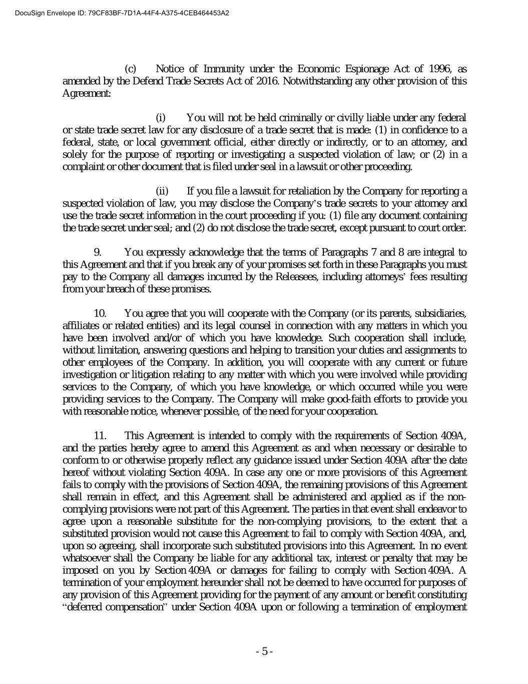 DocuSign Envelope ID: 79CF83BF-7D1A-44F4-A375-4CEB464453A2 (c) Notice of Immunity under the Economic Espionage Act of 1996, as amended by the Defend Trade Secrets Act of 2016. Notwithstanding any other provision of this Agreement: (i) You will not be held criminally or civilly liable under any federal or state trade secret law for any disclosure of a trade secret that is made: (1) in confidence to a federal, state, or local government official, either directly or indirectly, or to an attorney, and solely for the purpose of reporting or investigating a suspected violation of law; or (2) in a complaint or other document that is filed under seal in a lawsuit or other proceeding. (ii) If you file a lawsuit for retaliation by the Company for reporting a suspected violation of law, you may disclose the Company’s trade secrets to your attorney and use the trade secret information in the court proceeding if you: (1) file any document containing the trade secret under seal; and (2) do not disclose the trade secret, except pursuant to court order. 9. You expressly acknowledge that the terms of Paragraphs 7 and 8 are integral to this Agreement and that if you break any of your promises set forth in these Paragraphs you must pay to the Company all damages incurred by the Releasees, including attorneys’ fees resulting from your breach of these promises. 10. You agree that you will cooperate with the Company (or its parents, subsidiaries, affiliates or related entities) and its legal counsel in connection with any matters in which you have been involved and/or of which you have knowledge. Such cooperation shall include, without limitation, answering questions and helping to transition your duties and assignments to other employees of the Company. In addition, you will cooperate with any current or future investigation or litigation relating to any matter with which you were involved while providing services to the Company, of which you have knowledge, or which occurred while you were providing services to the Company. The Company will make good-faith efforts to provide you with reasonable notice, whenever possible, of the need for your cooperation. 11. This Agreement is intended to comply with the requirements of Section 409A, and the parties hereby agree to amend this Agreement as and when necessary or desirable to conform to or otherwise properly reflect any guidance issued under Section 409A after the date hereof without violating Section 409A. In case any one or more provisions of this Agreement fails to comply with the provisions of Section 409A, the remaining provisions of this Agreement shall remain in effect, and this Agreement shall be administered and applied as if the non- complying provisions were not part of this Agreement. The parties in that event shall endeavor to agree upon a reasonable substitute for the non-complying provisions, to the extent that a substituted provision would not cause this Agreement to fail to comply with Section 409A, and, upon so agreeing, shall incorporate such substituted provisions into this Agreement. In no event whatsoever shall the Company be liable for any additional tax, interest or penalty that may be imposed on you by Section 409A or damages for failing to comply with Section 409A. A termination of your employment hereunder shall not be deemed to have occurred for purposes of any provision of this Agreement providing for the payment of any amount or benefit constituting “deferred compensation” under Section 409A upon or following a termination of employment - 5 -