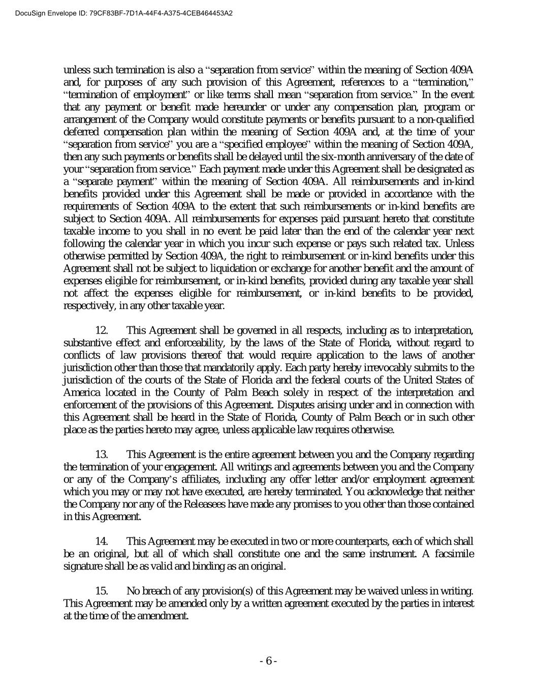 DocuSign Envelope ID: 79CF83BF-7D1A-44F4-A375-4CEB464453A2 unless such termination is also a “separation from service” within the meaning of Section 409A and, for purposes of any such provision of this Agreement, references to a “termination,” “termination of employment” or like terms shall mean “separation from service.” In the event that any payment or benefit made hereunder or under any compensation plan, program or arrangement of the Company would constitute payments or benefits pursuant to a non-qualified deferred compensation plan within the meaning of Section 409A and, at the time of your “separation from service” you are a “specified employee” within the meaning of Section 409A, then any such payments or benefits shall be delayed until the six-month anniversary of the date of your “separation from service.” Each payment made under this Agreement shall be designated as a “separate payment” within the meaning of Section 409A. All reimbursements and in-kind benefits provided under this Agreement shall be made or provided in accordance with the requirements of Section 409A to the extent that such reimbursements or in-kind benefits are subject to Section 409A. All reimbursements for expenses paid pursuant hereto that constitute taxable income to you shall in no event be paid later than the end of the calendar year next following the calendar year in which you incur such expense or pays such related tax. Unless otherwise permitted by Section 409A, the right to reimbursement or in-kind benefits under this Agreement shall not be subject to liquidation or exchange for another benefit and the amount of expenses eligible for reimbursement, or in-kind benefits, provided during any taxable year shall not affect the expenses eligible for reimbursement, or in-kind benefits to be provided, respectively, in any other taxable year. 12. This Agreement shall be governed in all respects, including as to interpretation, substantive effect and enforceability, by the laws of the State of Florida, without regard to conflicts of law provisions thereof that would require application to the laws of another jurisdiction other than those that mandatorily apply. Each party hereby irrevocably submits to the jurisdiction of the courts of the State of Florida and the federal courts of the United States of America located in the County of Palm Beach solely in respect of the interpretation and enforcement of the provisions of this Agreement. Disputes arising under and in connection with this Agreement shall be heard in the State of Florida, County of Palm Beach or in such other place as the parties hereto may agree, unless applicable law requires otherwise. 13. This Agreement is the entire agreement between you and the Company regarding the termination of your engagement. All writings and agreements between you and the Company or any of the Company’s affiliates, including any offer letter and/or employment agreement which you may or may not have executed, are hereby terminated. You acknowledge that neither the Company nor any of the Releasees have made any promises to you other than those contained in this Agreement. 14. This Agreement may be executed in two or more counterparts, each of which shall be an original, but all of which shall constitute one and the same instrument. A facsimile signature shall be as valid and binding as an original. 15. No breach of any provision(s) of this Agreement may be waived unless in writing. This Agreement may be amended only by a written agreement executed by the parties in interest at the time of the amendment. - 6 -