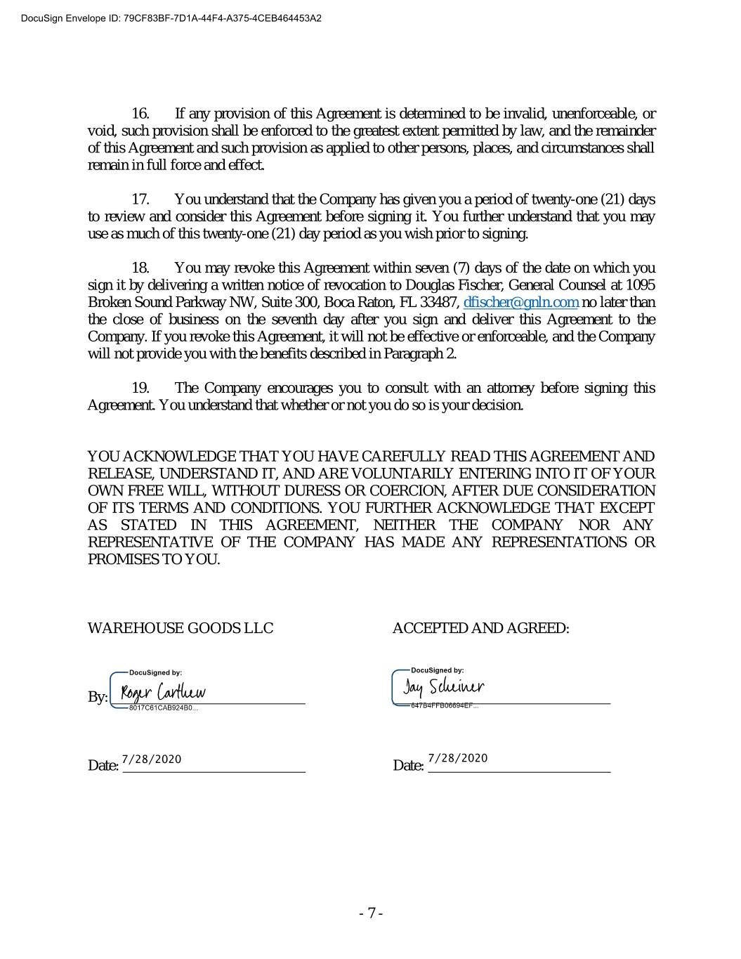 DocuSign Envelope ID: 79CF83BF-7D1A-44F4-A375-4CEB464453A2 16. If any provision of this Agreement is determined to be invalid, unenforceable, or void, such provision shall be enforced to the greatest extent permitted by law, and the remainder of this Agreement and such provision as applied to other persons, places, and circumstances shall remain in full force and effect. 17. You understand that the Company has given you a period of twenty-one (21) days to review and consider this Agreement before signing it. You further understand that you may use as much of this twenty-one (21) day period as you wish prior to signing. 18. You may revoke this Agreement within seven (7) days of the date on which you sign it by delivering a written notice of revocation to Douglas Fischer, General Counsel at 1095 Broken Sound Parkway NW, Suite 300, Boca Raton, FL 33487, dfischer@gnln.com no later than the close of business on the seventh day after you sign and deliver this Agreement to the Company. If you revoke this Agreement, it will not be effective or enforceable, and the Company will not provide you with the benefits described in Paragraph 2. 19. The Company encourages you to consult with an attorney before signing this Agreement. You understand that whether or not you do so is your decision. YOU ACKNOWLEDGE THAT YOU HAVE CAREFULLY READ THIS AGREEMENT AND RELEASE, UNDERSTAND IT, AND ARE VOLUNTARILY ENTERING INTO IT OF YOUR OWN FREE WILL, WITHOUT DURESS OR COERCION, AFTER DUE CONSIDERATION OF ITS TERMS AND CONDITIONS. YOU FURTHER ACKNOWLEDGE THAT EXCEPT AS STATED IN THIS AGREEMENT, NEITHER THE COMPANY NOR ANY REPRESENTATIVE OF THE COMPANY HAS MADE ANY REPRESENTATIONS OR PROMISES TO YOU. WAREHOUSE GOODS LLC ACCEPTED AND AGREED: By: 7/28/2020 Date: 7/28/2020 Date: - 7 -