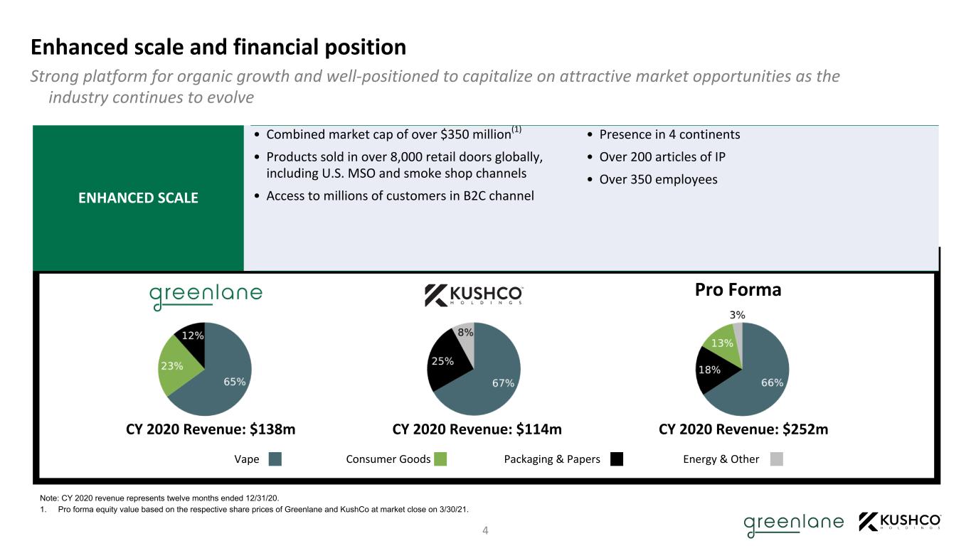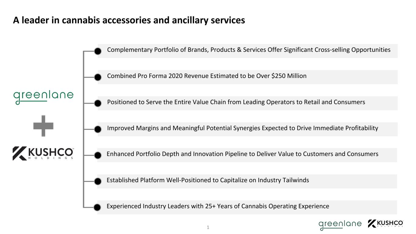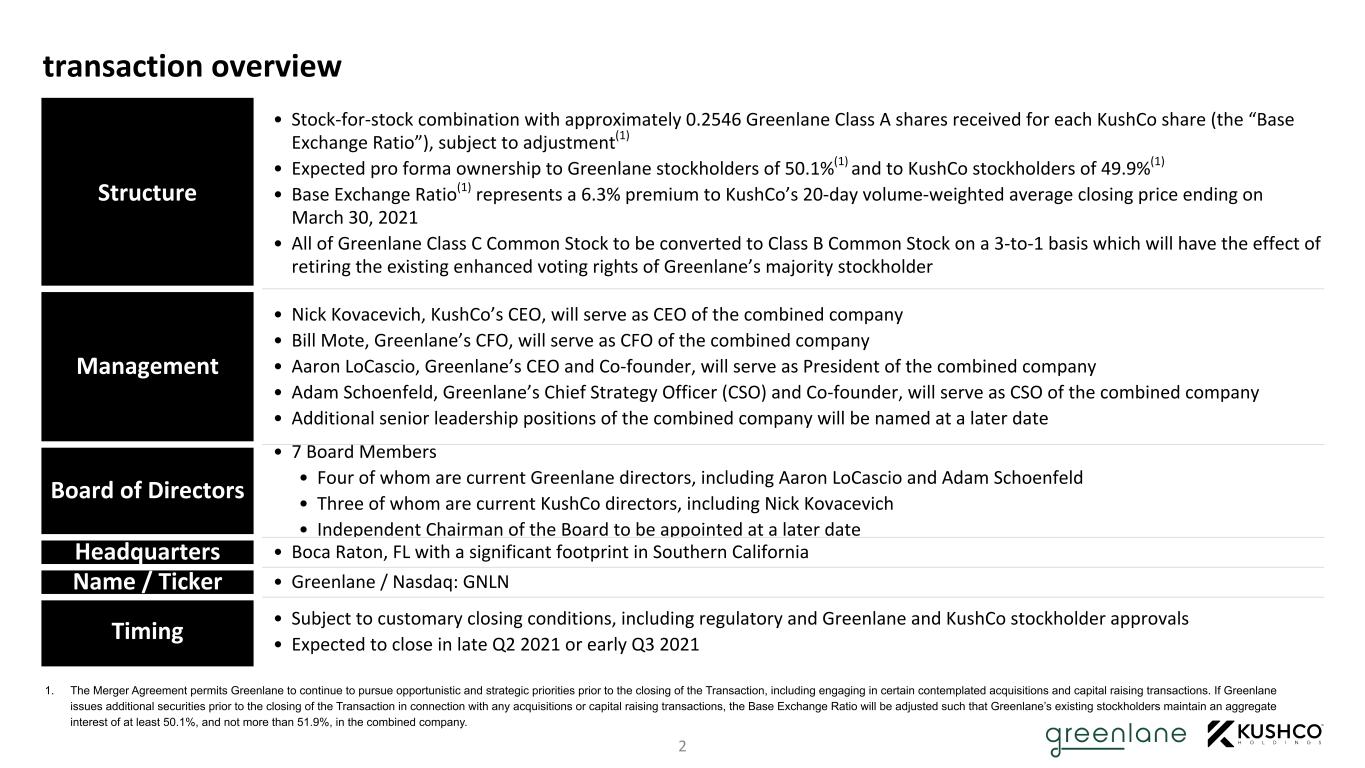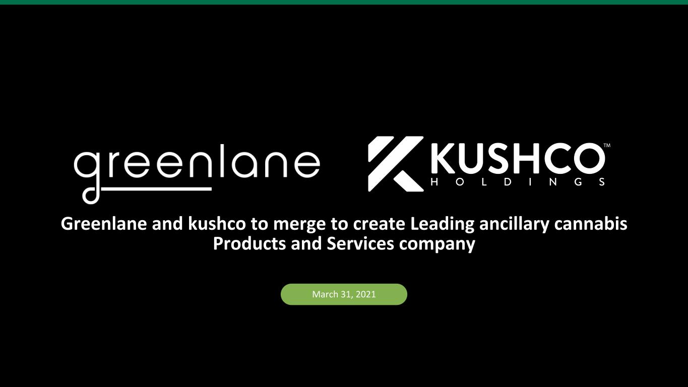 DISCLAIMER Cautionary Statement Regarding Forward-Looking Statements This presentation includes forward-looking statements. These forward-looking statements generally can be identified by phrases such as “will,” “expects,” “anticipates,” “foresees,” “forecasts,” “estimates” or other words or phrases of similar import. These forward-looking statements include, without limitation, Greenlane’s and KushCo’s expectations with respect to future performance and anticipated financial results of the merger and the timing of completion. These statements are based on current expectations, estimates and projections about the industry, markets in which Greenlane and KushCo operate, management’s beliefs, assumptions made by management and the transactions described in this presentation. While Greenlane’s and KushCo’s management believes the assumptions underlying the forward-looking statements and information are reasonable, such information is necessarily subject to uncertainties and may involve certain risks, many of which are difficult to predict and are beyond management’s control. These risks include, but are not limited to: (1) the occurrence of any event, change or other circumstances that could give rise to the termination of the merger agreement; (2) the outcome of any legal proceedings that may be instituted against the parties and others following announcement of the merger agreement; (3) the inability to consummate the transaction due to the failure to obtain the requisite stockholder approvals or the failure to satisfy other conditions to completion of the transaction; (4) risks that the proposed transaction disrupts current plans and operations of Greenlane and KushCo; (5) the ability to recognize the anticipated benefits of the transaction; and (6) the amount of the costs, fees, expenses and charges related to the transaction; and the other risks and important factors contained and identified in Greenlane’s and KushCo’s filings with the Securities and Exchange Commission (“SEC”), such as their respective Annual Reports on Form 10-K for the fiscal year ended December 31, 2020, and August 31, 2020, respectively, any of which could cause actual results to differ materially from the forward-looking statements in this communication. There can be no assurance that the merger will in fact be consummated. We caution investors not to unduly rely on any forward-looking statements. The forward-looking statements speak only as of the date of this presentation. Neither Greenlane nor KushCo is under any duty to update any of these forward-looking statements after the date of this communication, nor to conform prior statements to actual results or revised expectations, and neither Greenlane nor KushCo intends to do so. Important Information for Investors and Stockholders In connection with the proposed transaction, Greenlane expects to file with the SEC a registration statement on Form S-4 that will include a joint proxy statement of Greenlane and KushCo that also constitutes a prospectus of Greenlane, which joint proxy statement will be mailed or otherwise disseminated to Greenlane’s and KushCo’s respective stockholders when it becomes available. Greenlane and KushCo also plan to file other relevant documents with the SEC regarding the proposed transaction. INVESTORS ARE URGED TO READ THE JOINT PROXY STATEMENT/PROSPECTUS AND OTHER RELEVANT DOCUMENTS FILED WITH THE SEC IF AND WHEN THEY BECOME AVAILABLE, BECAUSE THEY WILL CONTAIN IMPORTANT INFORMATION. Investors and security holders may obtain free copies of the registration statement and the joint proxy statement/prospectus (if and when it becomes available) and other relevant documents filed by Greenlane and KushCo with the SEC at the SEC’s website at www.sec.gov. Copies of the documents filed by the companies will be available free of charge on their respective websites at www.gnln.com and www.kushco.com. Participants in Solicitation Greenlane, KushCo and their respective directors and executive officers may be considered participants in the solicitation of proxies in connection with the proposed transaction. Information about the directors and executive officers of Greenlane is set forth in its proxy statement for its 2020 annual meeting of stockholders, which was filed with the SEC on April 24, 2020. Information about the directors and executive officers of KushCo is set forth in its proxy statement for its 2021 annual meeting of stockholders, which was filed with the SEC on December 28, 2020. These documents can be obtained free of charge from the sources indicated above. Additional information regarding the participants in the proxy solicitations and a description of their direct and indirect interests, by security holdings or otherwise, will be contained in the joint proxy statement/prospectus and other relevant materials to be filed with the SEC when they become available. No Offer or Solicitation This communication is not intended to and shall not constitute an offer to sell or the solicitation of an offer to sell or the solicitation of an offer to buy any securities or a solicitation of any vote of approval, nor shall there be any sale of securities in any jurisdiction in which such offer, solicitation or sale would be unlawful prior to registration or qualification under the securities laws of any such jurisdiction. No offer of securities shall be made except by means of a prospectus meeting the requirements of Section 10 of the Securities Act of 1933, as amended.