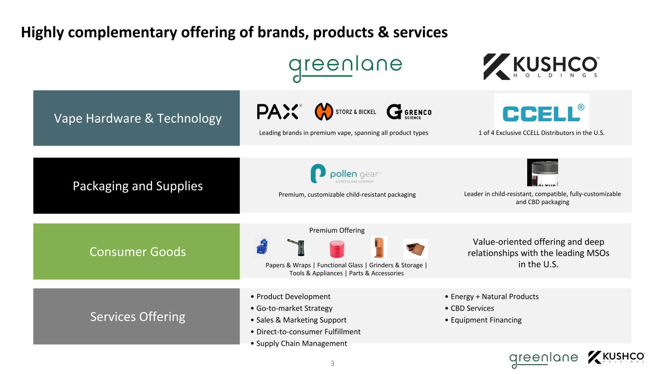 Structure • Stock-for-stock combination with approximately 0.2546 Greenlane Class A shares received for each KushCo share (the “Base Exchange Ratio”), subject to adjustment(1) • Expected pro forma ownership to Greenlane stockholders of 50.1%(1) and to KushCo stockholders of 49.9%(1) • Base Exchange Ratio(1) represents a 6.3% premium to KushCo’s 20-day volume-weighted average closing price ending on March 30, 2021 • All of Greenlane Class C Common Stock to be converted to Class B Common Stock on a 3-to-1 basis which will have the effect of retiring the existing enhanced voting rights of Greenlane’s majority stockholder Management • Nick Kovacevich, KushCo’s CEO, will serve as CEO of the combined company • Bill Mote, Greenlane’s CFO, will serve as CFO of the combined company • Aaron LoCascio, Greenlane’s CEO and Co-founder, will serve as President of the combined company • Adam Schoenfeld, Greenlane’s Chief Strategy Officer (CSO) and Co-founder, will serve as CSO of the combined company • Additional senior leadership positions of the combined company will be named at a later date Board of Directors • 7 Board Members • Four of whom are current Greenlane directors, including Aaron LoCascio and Adam Schoenfeld • Three of whom are current KushCo directors, including Nick Kovacevich • Independent Chairman of the Board to be appointed at a later date Headquarters • Boca Raton, FL with a significant footprint in Southern California Name / Ticker • Greenlane / Nasdaq: GNLN Timing • Subject to customary closing conditions, including regulatory and Greenlane and KushCo stockholder approvals • Expected to close in late Q2 2021 or early Q3 2021 transaction overview 2 1. The Merger Agreement permits Greenlane to continue to pursue opportunistic and strategic priorities prior to the closing of the Transaction, including engaging in certain contemplated acquisitions and capital raising transactions. If Greenlane issues additional securities prior to the closing of the Transaction in connection with any acquisitions or capital raising transactions, the Base Exchange Ratio will be adjusted such that Greenlane’s existing stockholders maintain an aggregate interest of at least 50.1%, and not more than 51.9%, in the combined company.