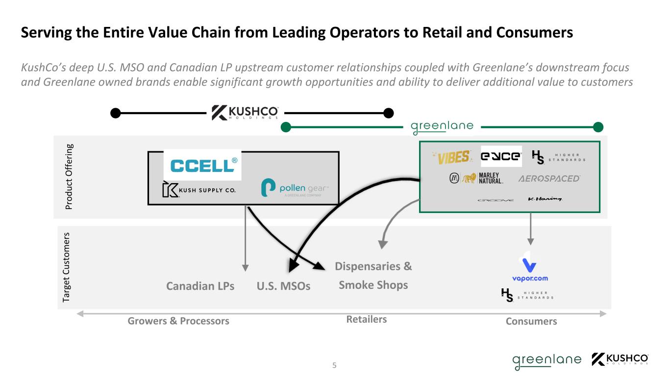 Complementary Revenue Base Enhanced scale and financial position 4 Note: CY 2020 revenue represents twelve months ended 12/31/20. 1. Pro forma equity value based on the respective share prices of Greenlane and KushCo at market close on 3/30/21. CY 2020 Revenue: $138m CY 2020 Revenue: $114m CY 2020 Revenue: $252m Pro Forma Vape Consumer Goods Packaging & Papers Energy & Other Strong platform for organic growth and well-positioned to capitalize on attractive market opportunities as the industry continues to evolve ENHANCED SCALE • Combined market cap of over $350 million(1) • Products sold in over 8,000 retail doors globally, including U.S. MSO and smoke shop channels • Access to millions of customers in B2C channel • Presence in 4 continents • Over 200 articles of IP • Over 350 employees