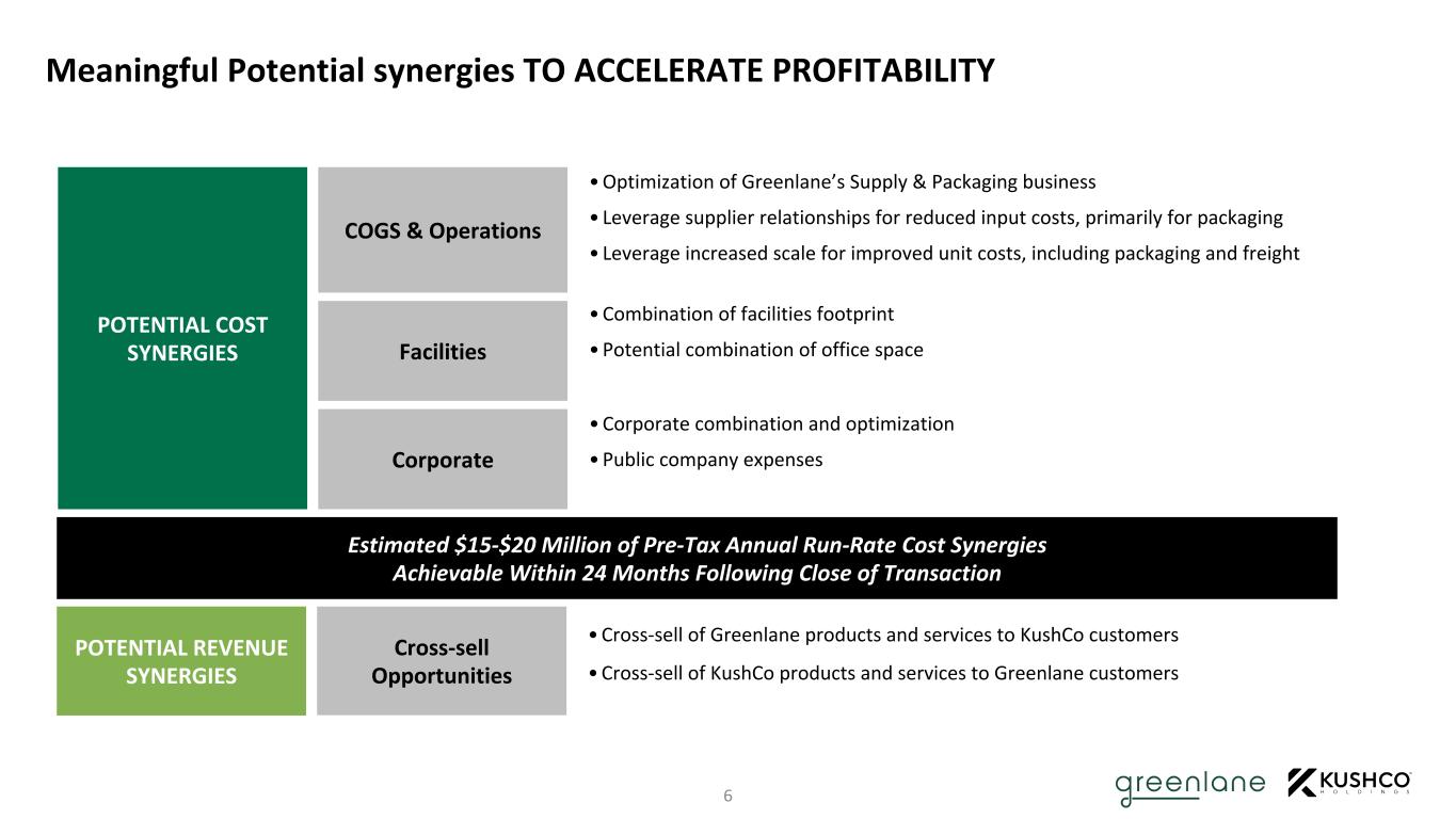 Serving the Entire Value Chain from Leading Operators to Retail and Consumers 5 Growers & Processors Retailers Consumers Ta rg et C u st o m er s P ro d u ct O ff er in g KushCo’s deep U.S. MSO and Canadian LP upstream customer relationships coupled with Greenlane’s downstream focus and Greenlane owned brands enable significant growth opportunities and ability to deliver additional value to customers Dispensaries & Smoke Shops U.S. MSOsCanadian LPs